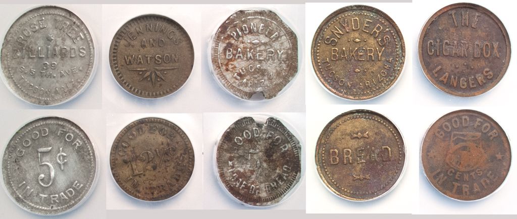 Lot of five. 1) The Cigar Box / Landers // GF 5c IT, 2) Pioneer Bakery / Tucson / Ariz // GF 5c loaf of bread. A lot of wear on this piece. 3) Jennings & Watson // GF 12 1/2c IT. 4) Snyder's Bakery / Tucson, Arizona // Bread. 5) Rose Tree Billiards / 39 S. 5th Ave / Tucson, Ariz // GF 5c IT.City: TucsonCounty: PimaState: AZDate:
