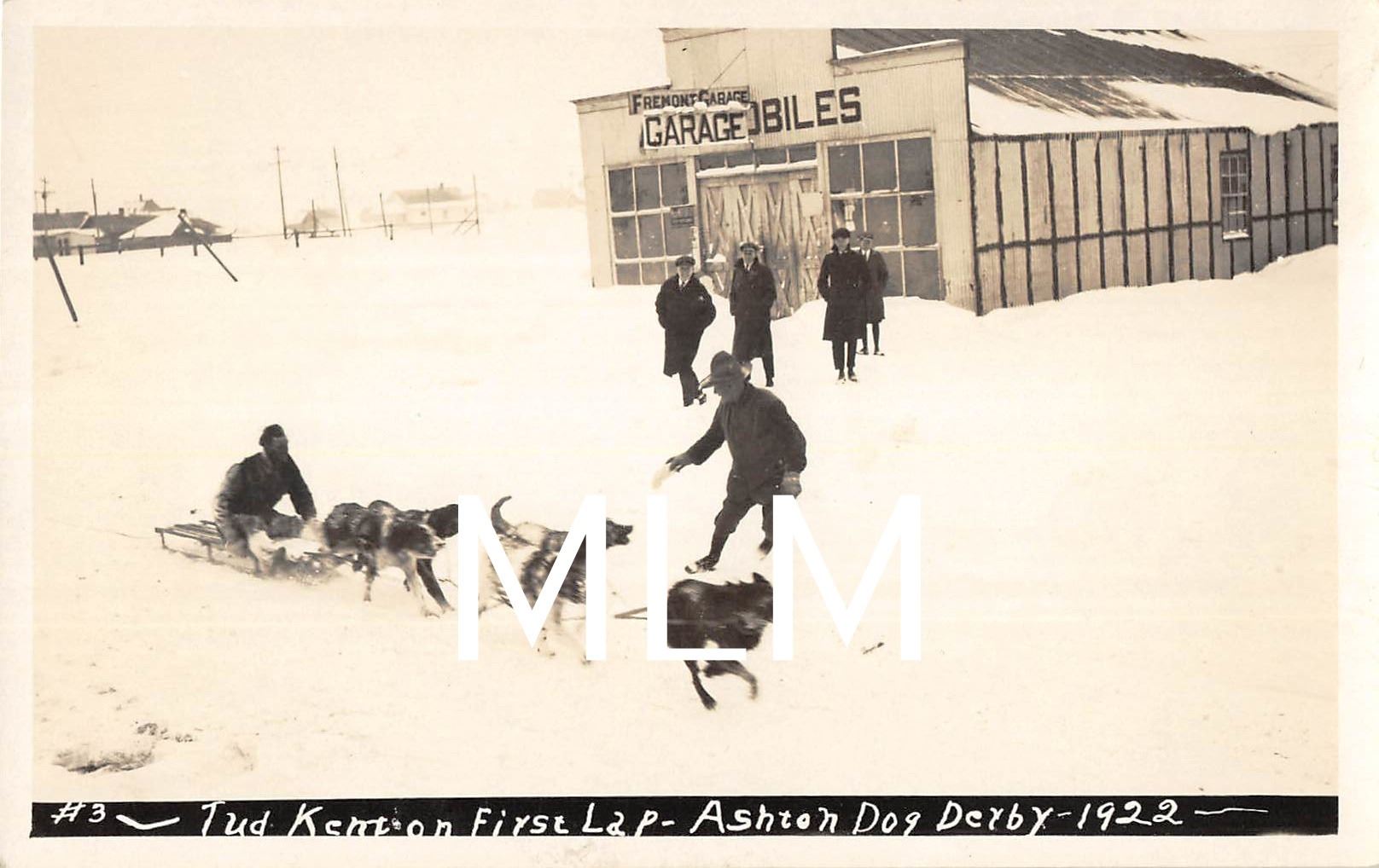 Tud Kent on 1st Lap Ashton Dog Derby 1922 Auto Garage Idaho Photo Postcard