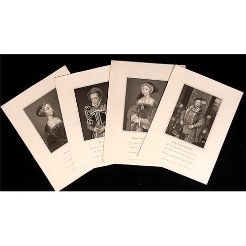 <Our item number 140137><B>[Tudor England] Ten Engravings After Holbein.</B> Published between 1815 and 1825 by Lackington, Hughes, Harding, Mayor & Jones, and others; drawn and engraved by various artists from the original Holbein portraits. Each page is 13½ x 10¼ in. Light toning to pages, not affecting the portraits. Portraits are of: King Edward the Sixth, Queen Mary, Queen Anna Bullen, Queen Jane Seymour, Queen Catharine Par, Margaret Tudor (Queen of Scotland), Edward Seymour (Duke of Somerset, Lord Protector), Cardinal Wolsey, Thomas Cromwell (Earl of Essex), and Sir John Moore. <BR>Estimated Value $300 - 500. <BR><BR>Our item number 140137<BR><IMAGES><P ALIGN="CENTER"><IMG SRC="http://www.goldbergcoins.net/liveauction/49jpegs/140137.jpg"> </P></IMAGES>