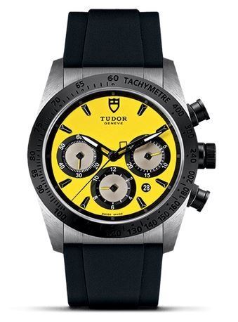 Model: 42010N-0007 - CASE = [Material:Ceramic], [Case Diameter:42], [Bezel:Fixed with Tachymeter Scale], [Case Back:Solid], [Water Resistant:150 Meters - 500 Feet], [Crystal:Scratch Resistant Sapphire Crystal],; DIAL = [Color:Yellow Chronograph with Date at 4],; MOVEMENT = [Type:Automatic Self-winding mechanical chronograph movement, TUDOR calibre 7753], [Crown:Screw Down],; BAND = [Clasp:Folding], [Type:Black Rubber], (In Stock - Ready to ship.)