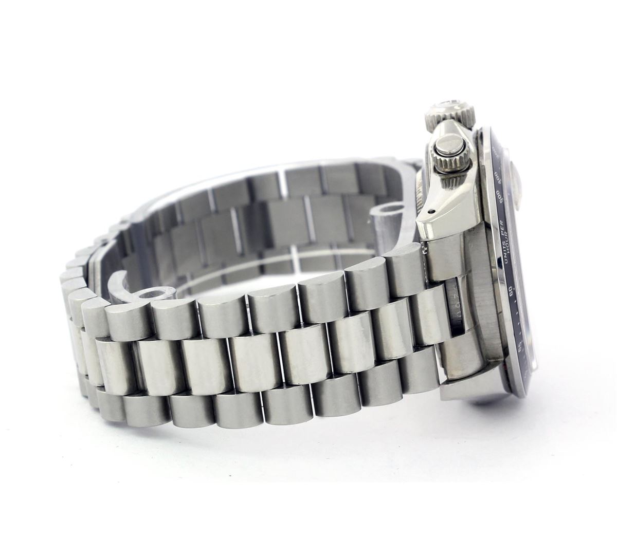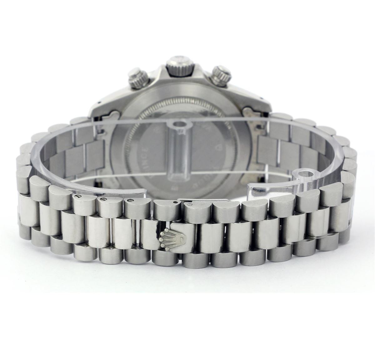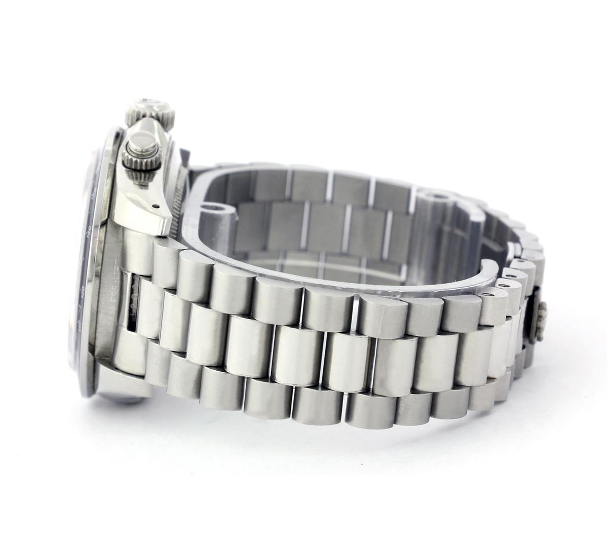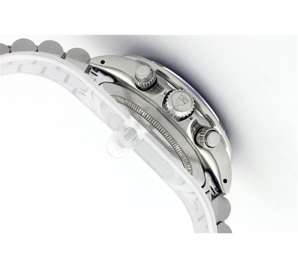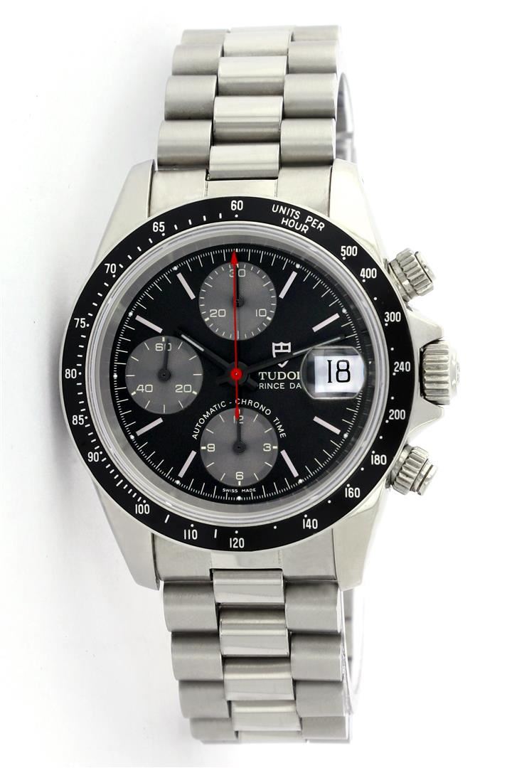 One Gents Stainless Steel Tudor Prince Date Tiger, Serviced & Electronically Tested, Case:41mm, Stainless Steel Crown, Bezel: Stainless Steel Bezel, Crystal: Sapphire Lens. Movement: Automatic Winding Movement. Dial: Silver Dial With Index Hour Markers with 3 sub dials, Date window at 3 O'Clock position. Model: Prince Tudor Condition: G-6 Extra Fine. Custom Band: Stainless Steel President Band, 7.5 Inch Length, Adjustable. Standard Clasp, Rolex Clasp Mark.