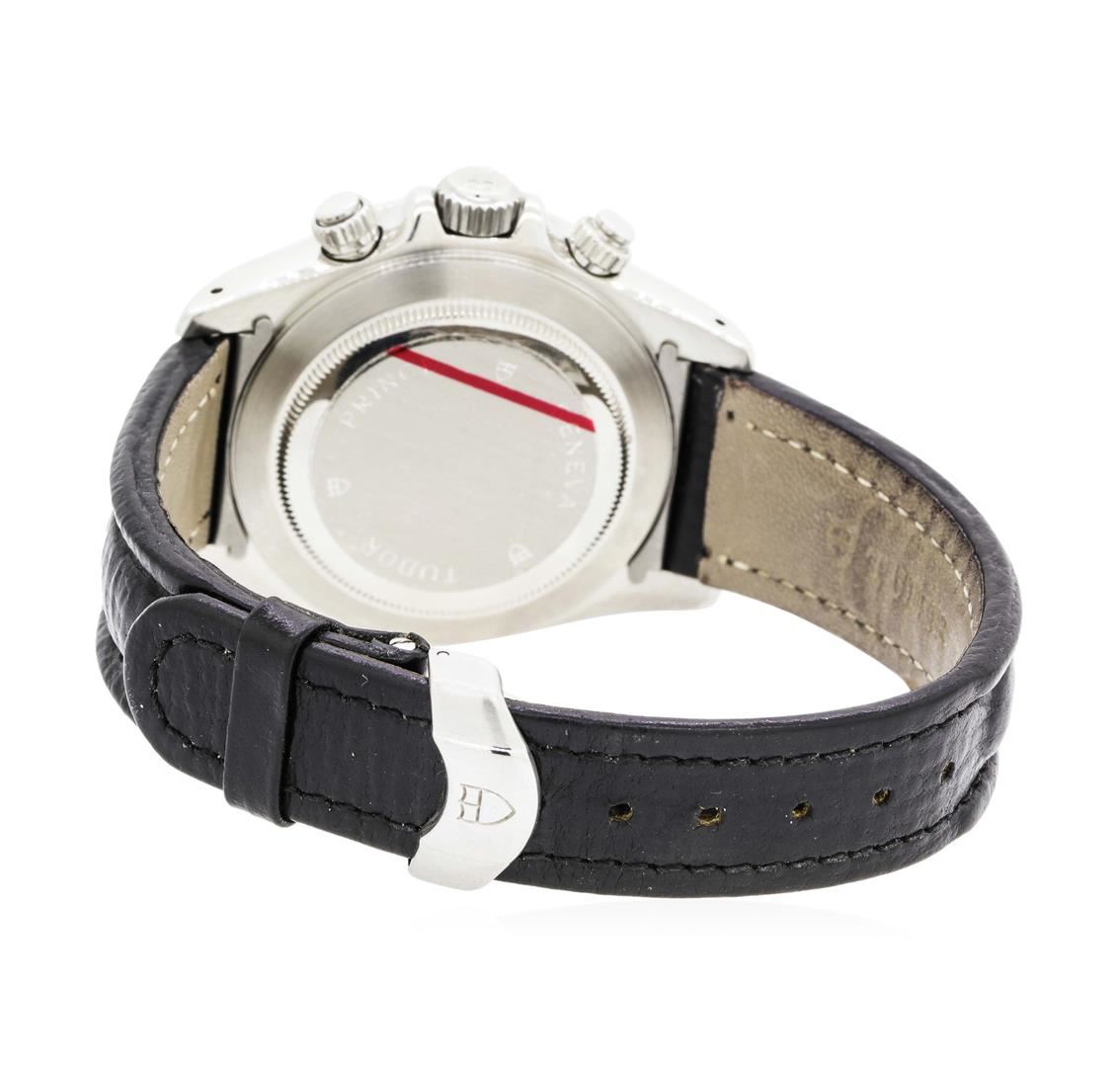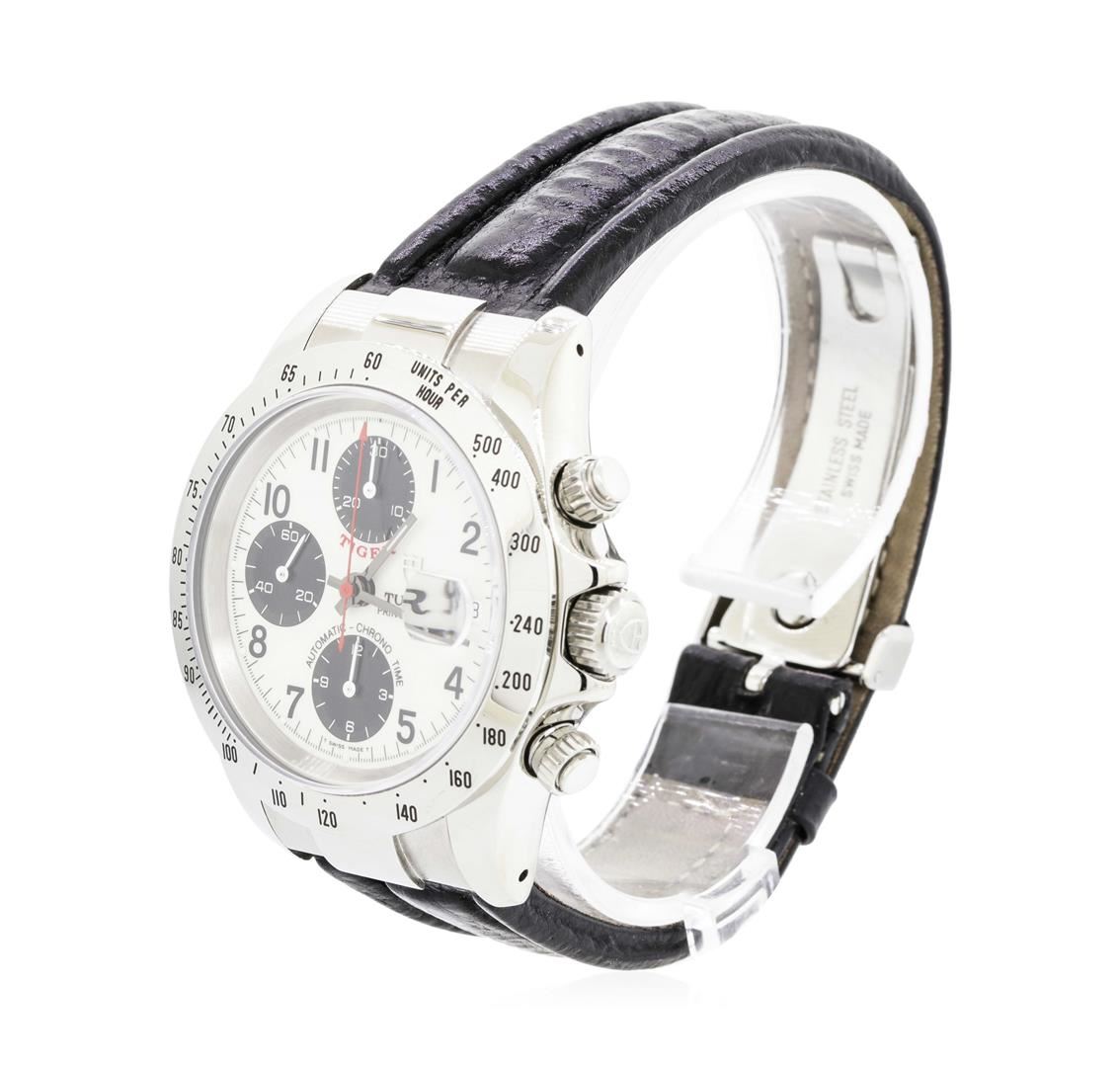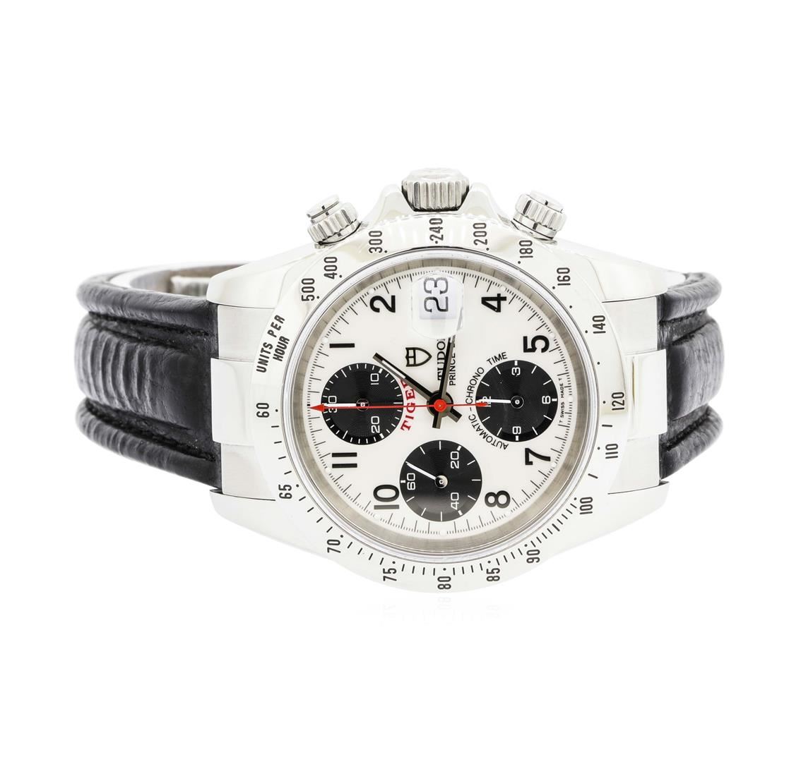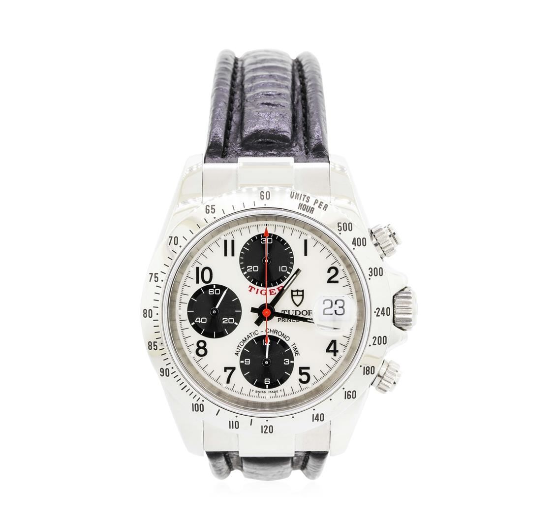 One stainless steel Tudor Princedate Tiger chronograph wristwatch with a black leather strap featuring: opaline dial with three black subdials. Crystal: synthetic sapphire with cyclops lens. Watch number: B964659