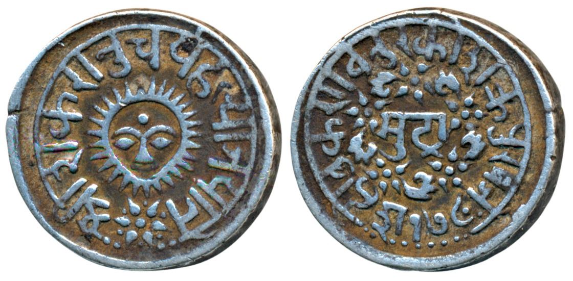 Tukoji Rao II, Silver Presentation Mudra, 11.09g, Saka 1780 (AD 1858), word Mudra encircled by legend in Devanagari Holakaravatur Kaushakapura sha 1780, rev. sunburst encircled by legend Sri Shankaranucharya Ahlya Jayati (KM 17). About Extremely Fine, Very Rare.