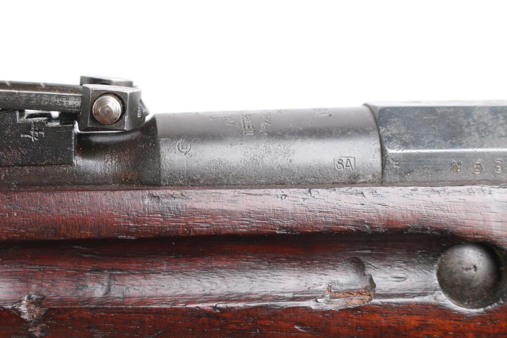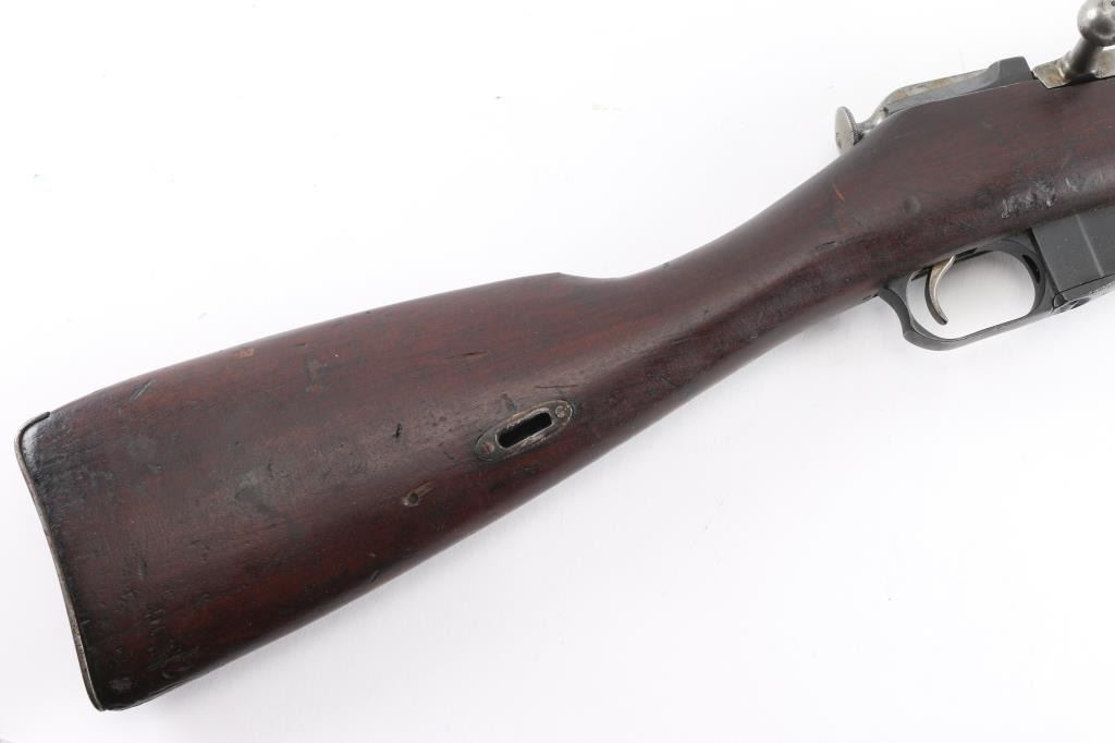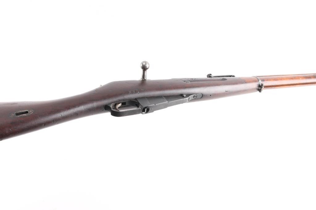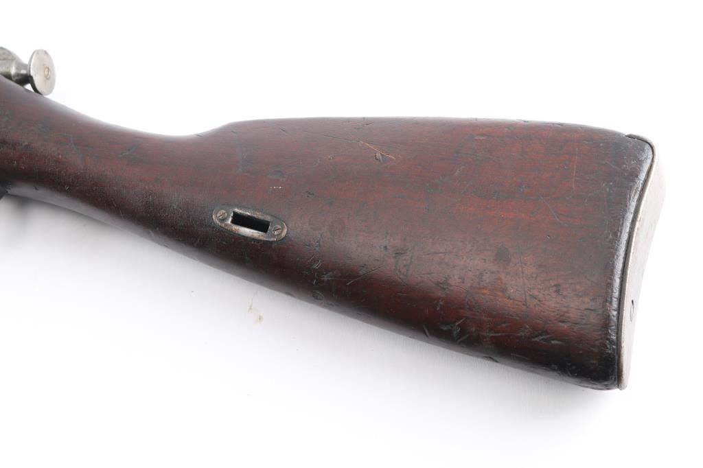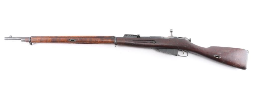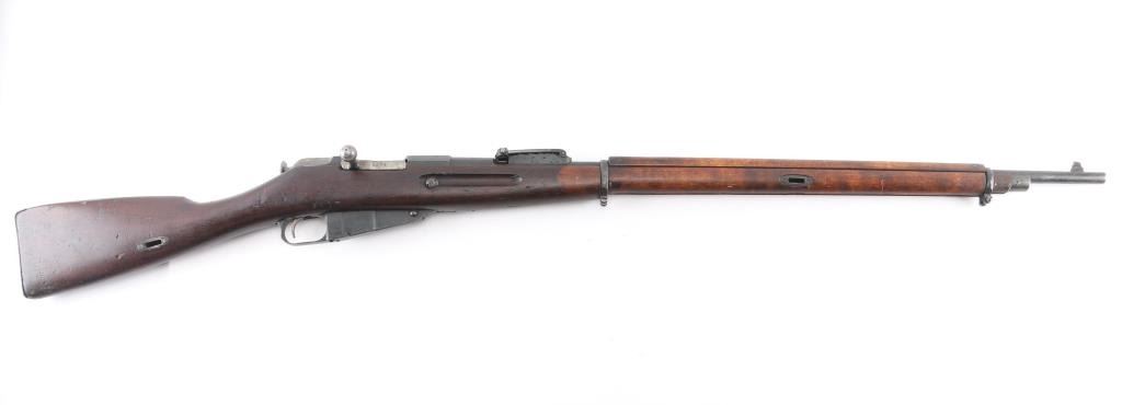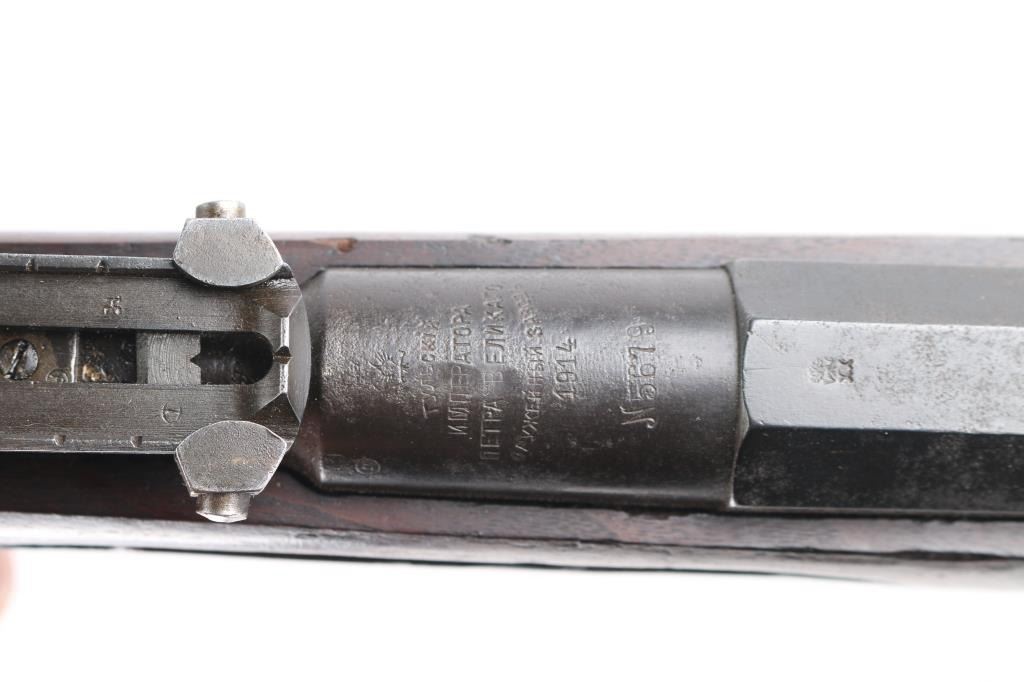 WW1 Imperial Russian military blued bolt action rifle with a 31-1/2" barrel Dated 1914. Made at the "Tula/ Emperor Peter the Great Ordnance Factory" (Marked on barrel). Imperial crest on barrel is feint. CAI import mark on upper right barrel. Bore is rough/dark, but rifling present, Wood is good with the usual dents/dings. Action works well. Blued metal finish is mostly there, has dulled, scattered pin-prick pitting on lower barrel, & receiver. Markings are clear, matched serial numbers on barrel,receiver,& bolt. 'SA' in box on the left barrel indicating use by the Finnish army at some point. Action works well. No cleaning rod.