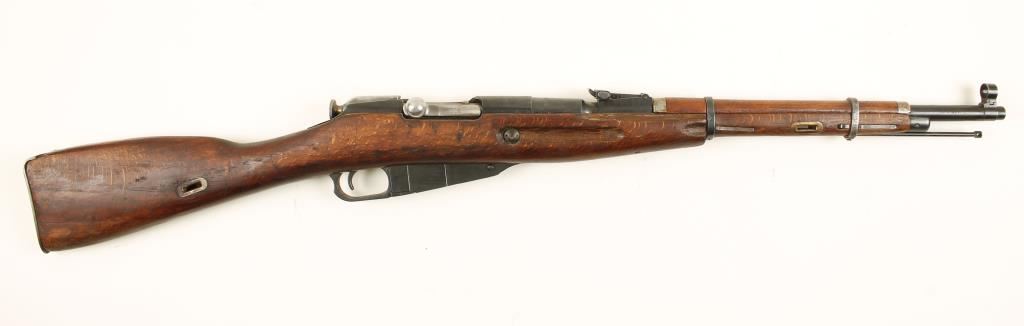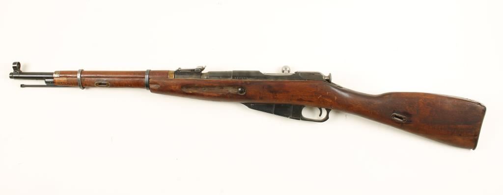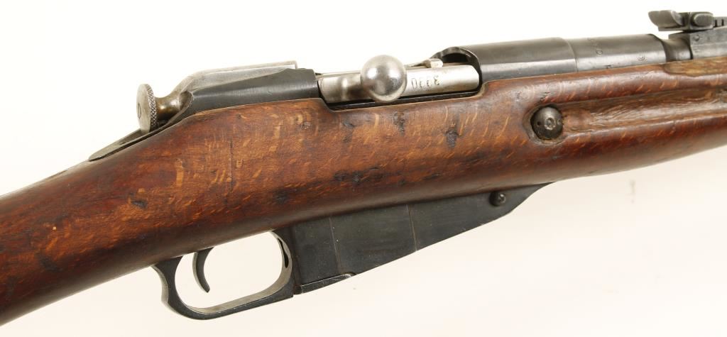 Blued Russian military bolt-action carbine with a 20" barrel. Import marked. Bluing has edge wear. Butt plate is bare metal with dings and stains and a serial number that doesn't match the receiver. Wood stock is rough with a large replacement piece at the toe of the butt and another at the forend nosecap. Bore is slightly frosty with good rifling. Action works well. Condition is fair. *Modern Firearm*