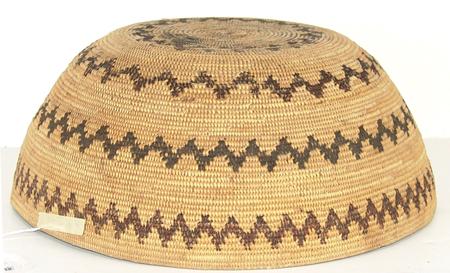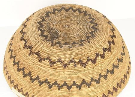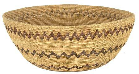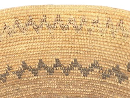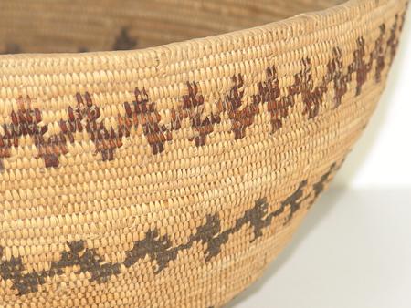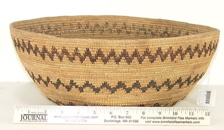 Circa Early 1900s, Large cooking basket with flared sides and three  rows of zig-zags in red and black.  Good  condition. 5-1/2" x 14"    From the Johnson Collection.