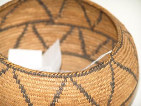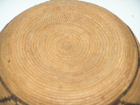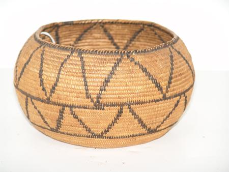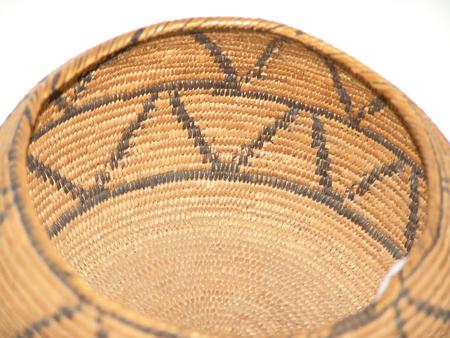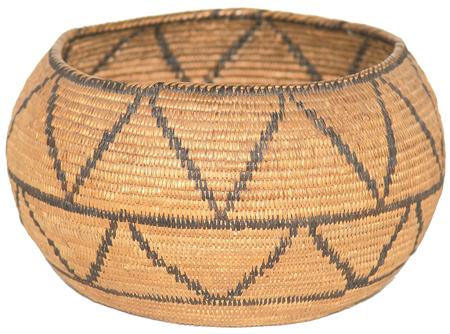 Circa 1900, Finely woven globular bowl with repeating triangle/zig-zag pattern. Very good condition, a few missing stitches. 4-1/4" x 7" From the Johnson Collection.