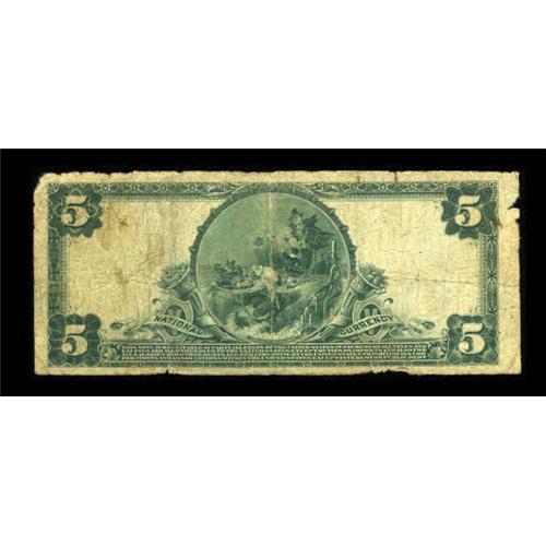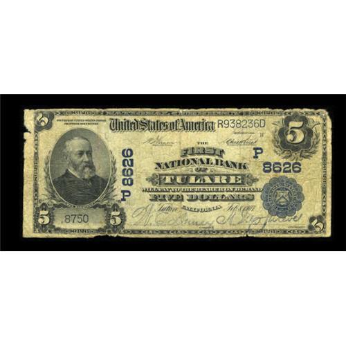 <B>Tulare, CA</B></I> - $5 1902 Plain Back Fr. 600 <B>The First NB</B></I> Ch. # (P)8626<BR> A very scarce note from the only collectible bank to issue from here. <B>Very Good, </B></I>with a few chips out of the margins and a rounded corner, but otherwise sound and displaying clear signatures. <BR><BR><b>Shipping:</b> Coins & Currency (<a target="_blank" href="http://www.heritageauctions.com/common/shipping.php">view shipping information</a>)