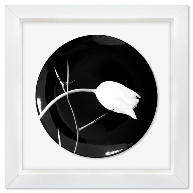 "Tulip (1988)" is a Limoges porcelain plate bearing the plate signature inverso of Robert Mapplethorpe (1946-1989). This plate is custom framed and floated on linen. Measures approx. 13.5" x 13.5" (frame), 8.5" (plate diameter).