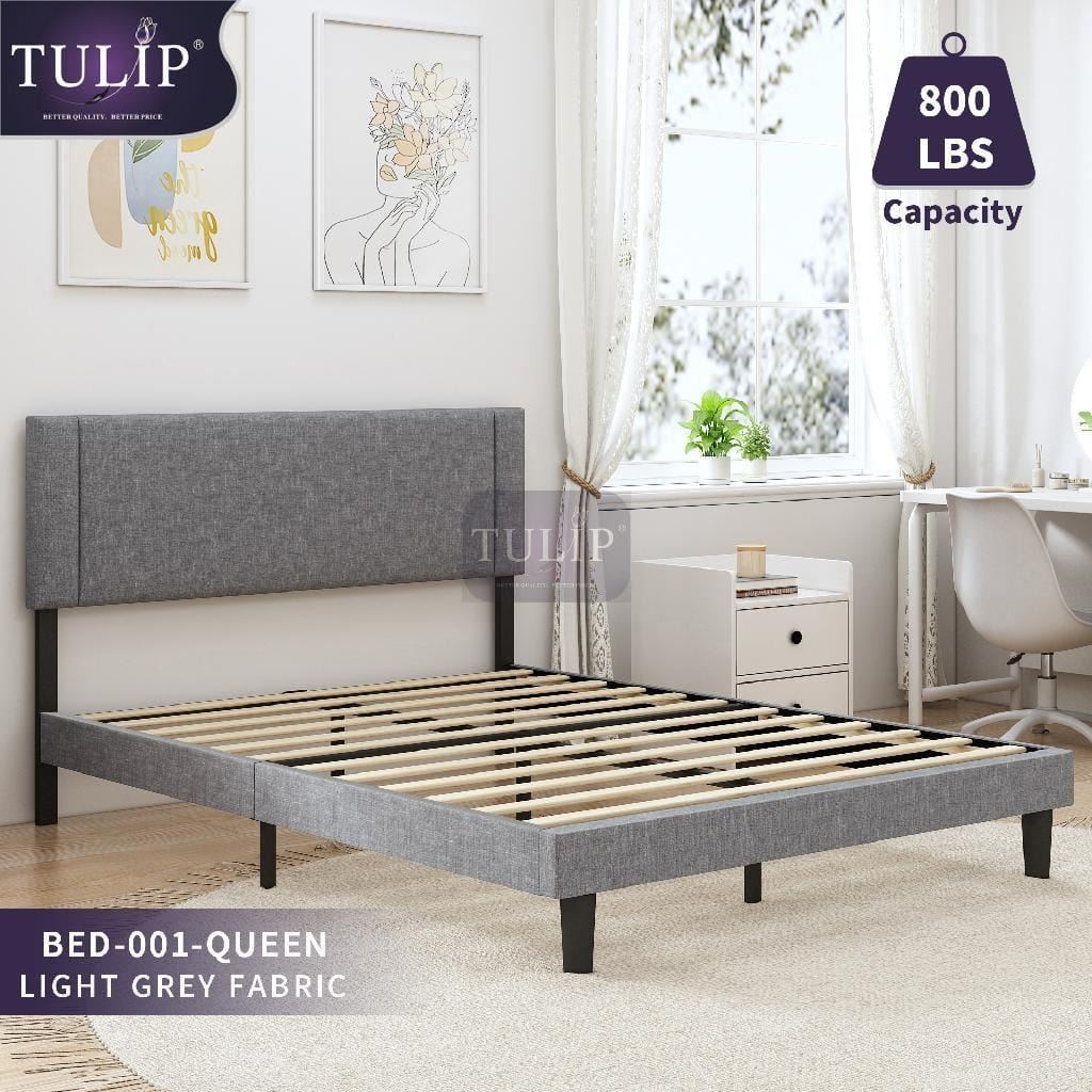 Brand new Tulip Bed frames- New in Box (Grey Fabric) Size- 001 Queen Retail Price- $470