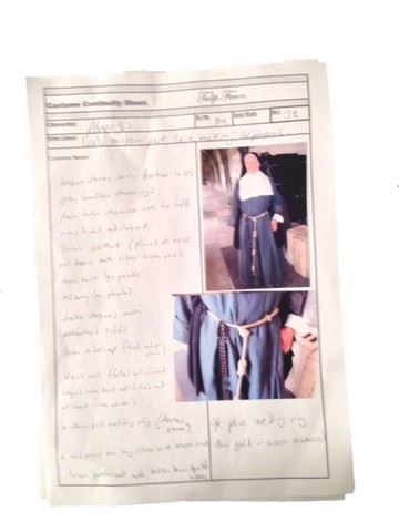 From the studio archives, this is Abbess (Judi Dench) screen worn, hero, plain green linen chemise with tie cuffs, nuns habbit and tabbard, linen white petticaot (production soiled), fabric sleeves with attached cuffs, white linen partlet, cream linen cap with ties, black cotton veil, brown shoes with leather laces, rope belt and rosary. Labels inside the petticoat and nuns dress with"Abbess" written on them. Worn in the scene where she leads Willem past the orphans. Continuity sheets included.