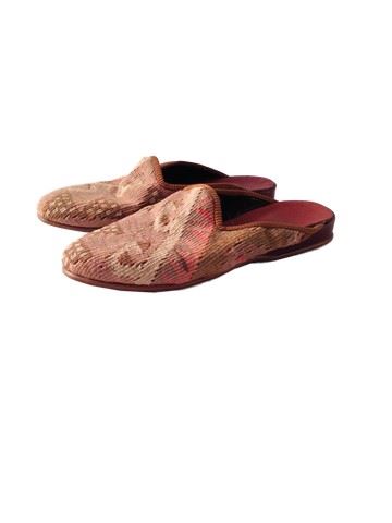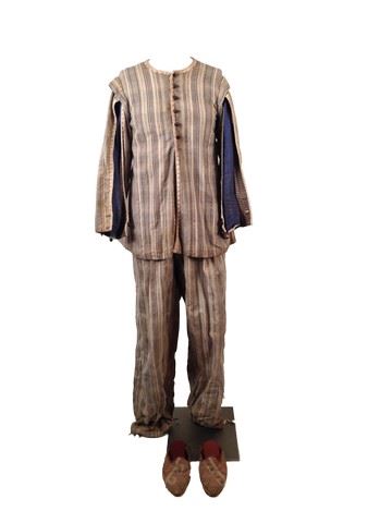 Cornelis (Christoph Waltz) screen worn, hero, striped cream, blue, and white pajama set with a slashed sleeve, under sleeve is blue, rose, brown with a slight red heel slippers, woven with a cream color pattern.