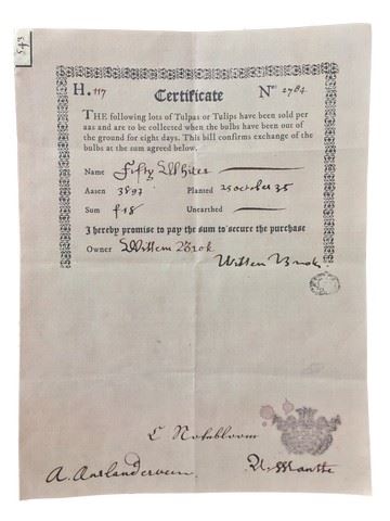 Jan Van Loos (Dane DeHaan) screen used, "Certificate To Pay". This was given as a promise of payment once the bulbs have been out of the ground for 8 days from Williem Brok (Jack O' Connell) to Jan Van Loos. Scenes 72, 37. (19"x7")