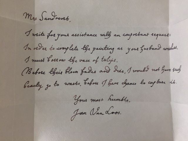 Jan Van Loos (Dane DeHaan) screen used, hand written letter to Sophia (Alicia Vikander), from Jan Van Loos, a scripted letter requesting to borrow the vase of tulips before their bloom fades and dries. This was from scene 58A.