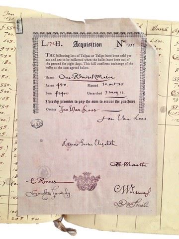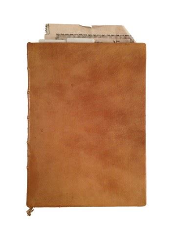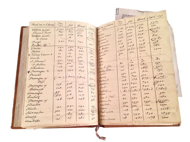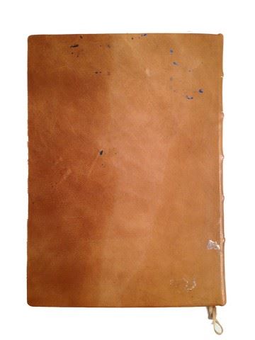 Jan Van Loos (Dane DeHaan) screen used, hero, light brown hard cover leather notebook with flower inventory and acquisition receipts on parchment type paper, along with a note sealed by red wax on grey paper. There are small blue and white paint smears on the back cover. A majority of the pages are blank. (11"x8").
