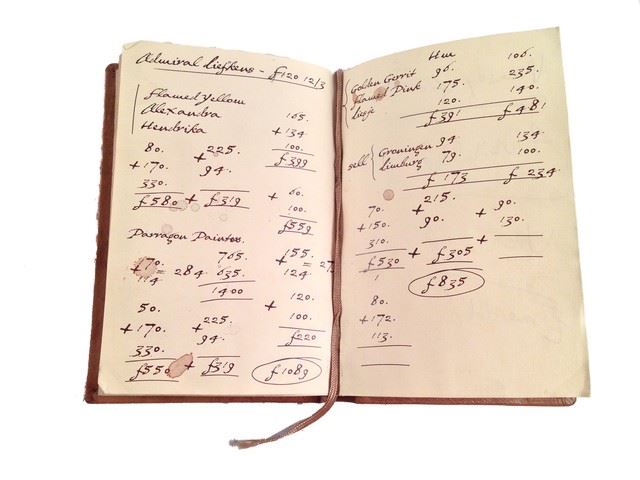 Jan Van Loos (Dane DeHaan) screen used, hero, light brown hard cover leather notebook with several pages of hand scribbled notes as well as a couple of pages detailing various flower prices. A majority of the pages are blank. (8.5"x5.5").