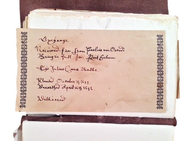 Jan Van Loos (Dane DeHaan) screen used, hero, brown leather notebook with various flower prices, inventories, and receipts on parchment type paper. Bound with leather string. A majority of the pages are blank. (9"x7"x1.5").