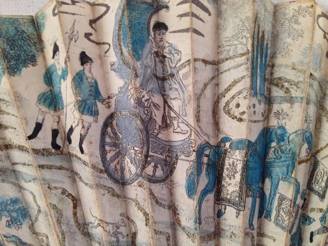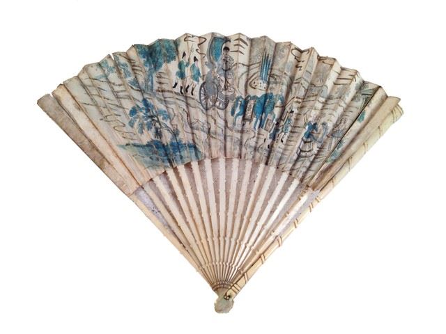 Jan Van Loos (Dane DeHaan) screen used, hero, paper fan with plastic frame, detailed with turquoise and sparkly gold etchings of nature, village, and religious imagery. One of the fan leafs is loose and almost completely broken off. (14"x10" opened).