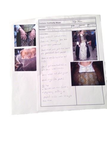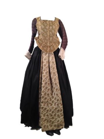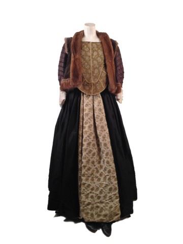 Sophia (Alicia Vikander) screen worn, hero, custom made, plain gold embroidered bodice with brown corded sleeves, black skirt with gold trim hem and patterned front panel, white quilted under skirt, black silk under skirt, brown velvet fur gilet, black embossed leather shoes with red heel. Pregnancy padding and costume continuity sheets included. Labels inside the bodice, coat, and all three skirts with "Sophia" written on them. This is her regency outfit, worn in several scenes of the film.