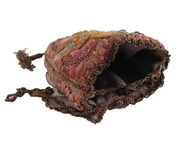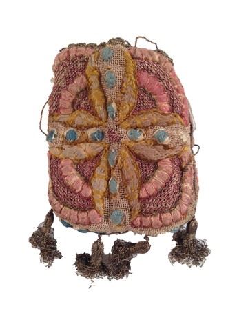 Sophia (Alicia Vikander) screen used, hero, pink, turqoise and brown embroidered purse with 4 gold colored tassles. (4"x3").