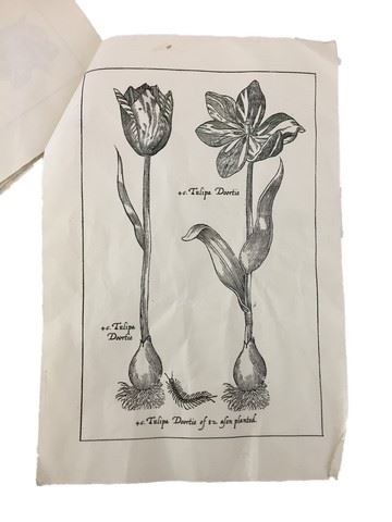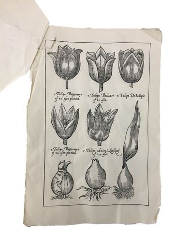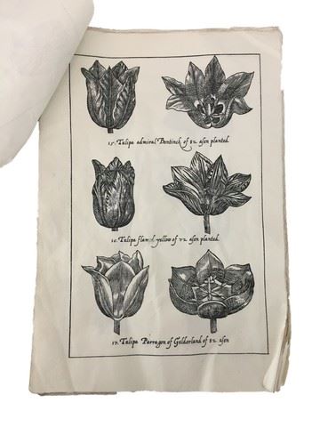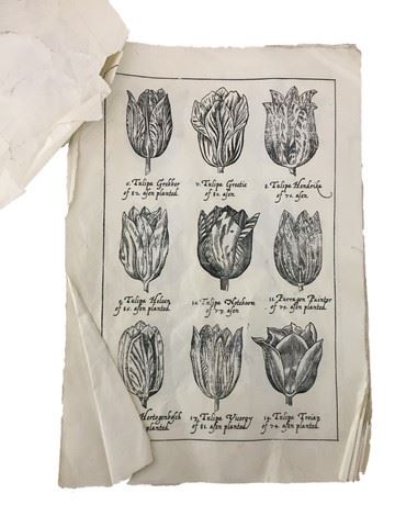 Screen used, catalog "A Collection of Tulips" drawn with their names and the weight of their bulbs. 10 pages of various tulips, written in 1663, by P. Haan, catalog is very worn and is only held together with yarn in the left hand corner. (14x10)