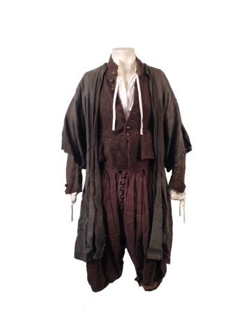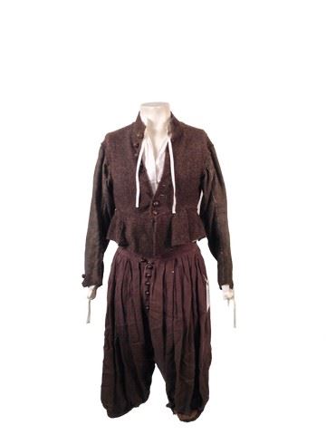Willem (Jack O'Connell) screen used, hero, cream linen shirt with ties at neck and wrist, green woven doublet with large round leather buttons, green linen breeches broken down with wood buttons, grey linen fishmonger coat with 1/4 length sleeves. Brown leather belt with white stitching at the top and also included is a pair of brown woven breeches with antique rounded brass buttons. Continuity sheets included.
