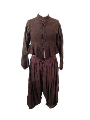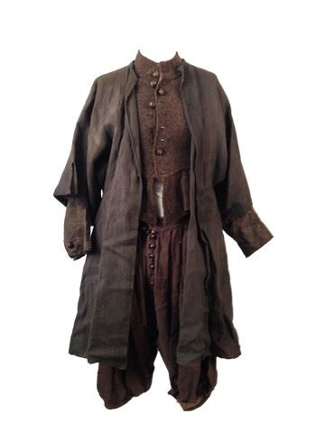 Willem (Jack O'Connell) screen used, hero, green woven doublet with large round leather buttons, green linen breeches broken down with round wooden buttons, grey linen fishmonger coat with no fastenings and broken down, 1/4 length sleeves. Continuity sheets included.