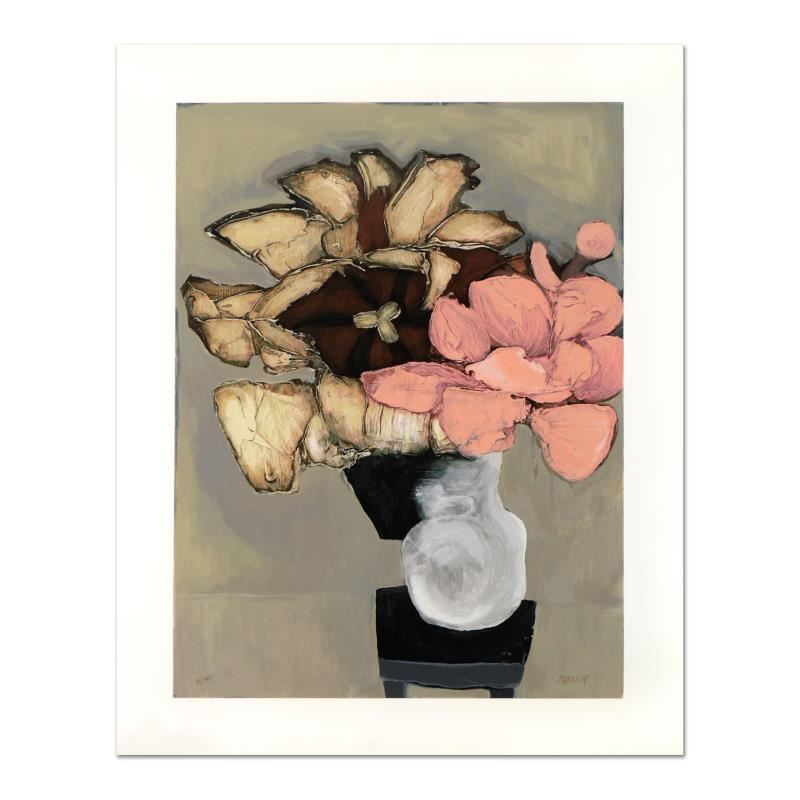 "Tulip & Pink Flower" is a limited edition serigraph on paper by Brenda Barnum, numbered and hand signed by the artist. Includes Certificate of Authenticity. Measures approx. 28" x 36" (border), 22" x 30" (image).