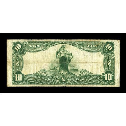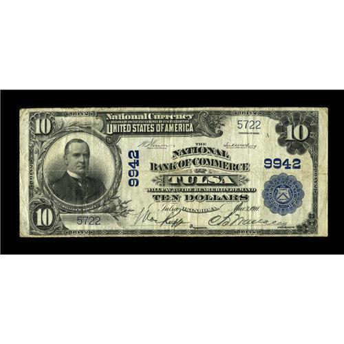 <B>Tulsa, OK</B></I> - $10 1902 Plain Back Fr. 627 <B>The NB of Commerce</B></I> Ch. # 9942<BR>This note inches up the tally on this bank to only 7 large. It is noticed that serial number 5727 is listed twice in the census. This $10 is blessed with nice pen signatures of the assistant cashier and president. <B>Fine.</B></I><BR><BR><b>Shipping:</b> Coin/Currency (<a target="_blank" href="http://www.heritageauctions.com/common/shipping.php">view shipping information</a>)
