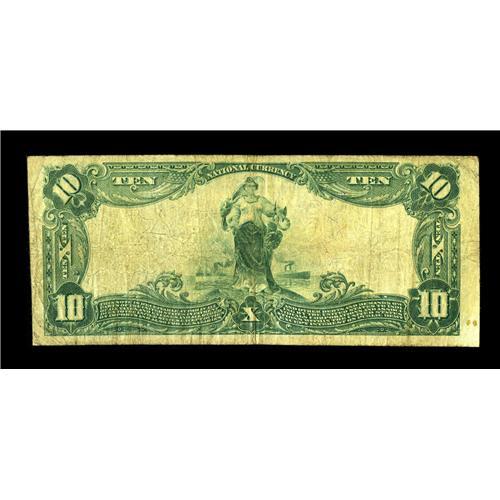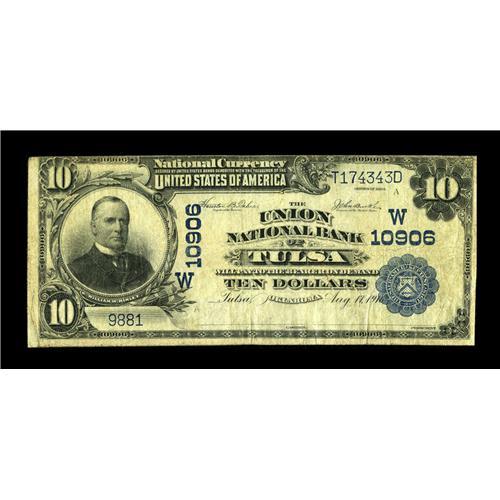 <B>Tulsa, OK</B></I> - $10 1902 Plain Back Fr. 632 <B>The Union NB</B></I> Ch. # (W)10906<BR>Large notes only from this short lived bank, which lasted only from 1916 through 1920. Just five examples are known, with the Gengerke data showing no offerings at public sale since an appearance on a 1992 fixed price list. <B>Fine,</B></I> the signatures faded.<BR><BR><b>Shipping:</b> Coin/Currency (<a target="_blank" href="http://www.heritageauctions.com/common/shipping.php">view shipping information</a>)