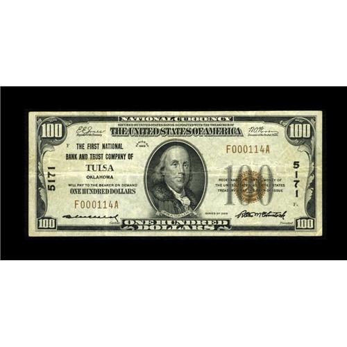 <B>Tulsa, OK</B></I> - $100 1929 Ty. 1 <B>The First NB & TC</B></I> Ch. # 5171<BR>A nice <B>Very Fine</B></I> from this relatively available Tulsa location. Expect bids in the range of...<BR><BR><b>Shipping:</b> Coin/Currency (<a target="_blank" href="http://www.heritageauctions.com/common/shipping.php">view shipping information</a>)