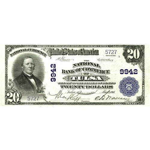 <B>Tulsa, OK</B></I> - $20 1902 Plain Back Fr. 653 <B>The NB of Commerce</B></I> Ch. # 9942<BR>A very scarce Tulsa bank with just $650 in large size outstanding in 1935. This is by far the nicest large example known from here. <B>Extremely Fine,</B></I> with the bright white paper and vivid inks of a gem new specimen.