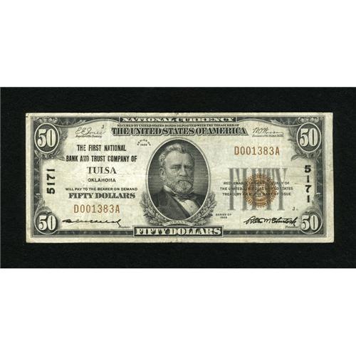 <B>Tulsa, OK</B></I> - $50 1929 Ty. 1 <B>The First NB & TC</B></I> Ch. # 5171<BR>Solid paper is noted on this mid-grade note. <B>Fine-Very Fine.</B></I><BR><BR><b>Shipping:</b> Coins & Currency (<a target="_blank" href="http://www.heritageauctions.com/common/shipping.php">view shipping information</a>)