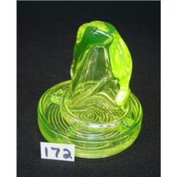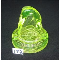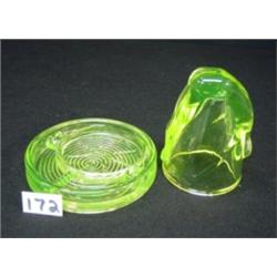 4" Tumble-up style Vaseline glass nude draped over liquor or medicine drinking glass and resting in a fitted holding tray w/a pair of round depressions (for cigarettes?) and 2 sections for lemon, ashes or pills, You pick! Unmarked w/concentric rings under base which is just shy of 4", glass is 3 5/8" tall by itself.