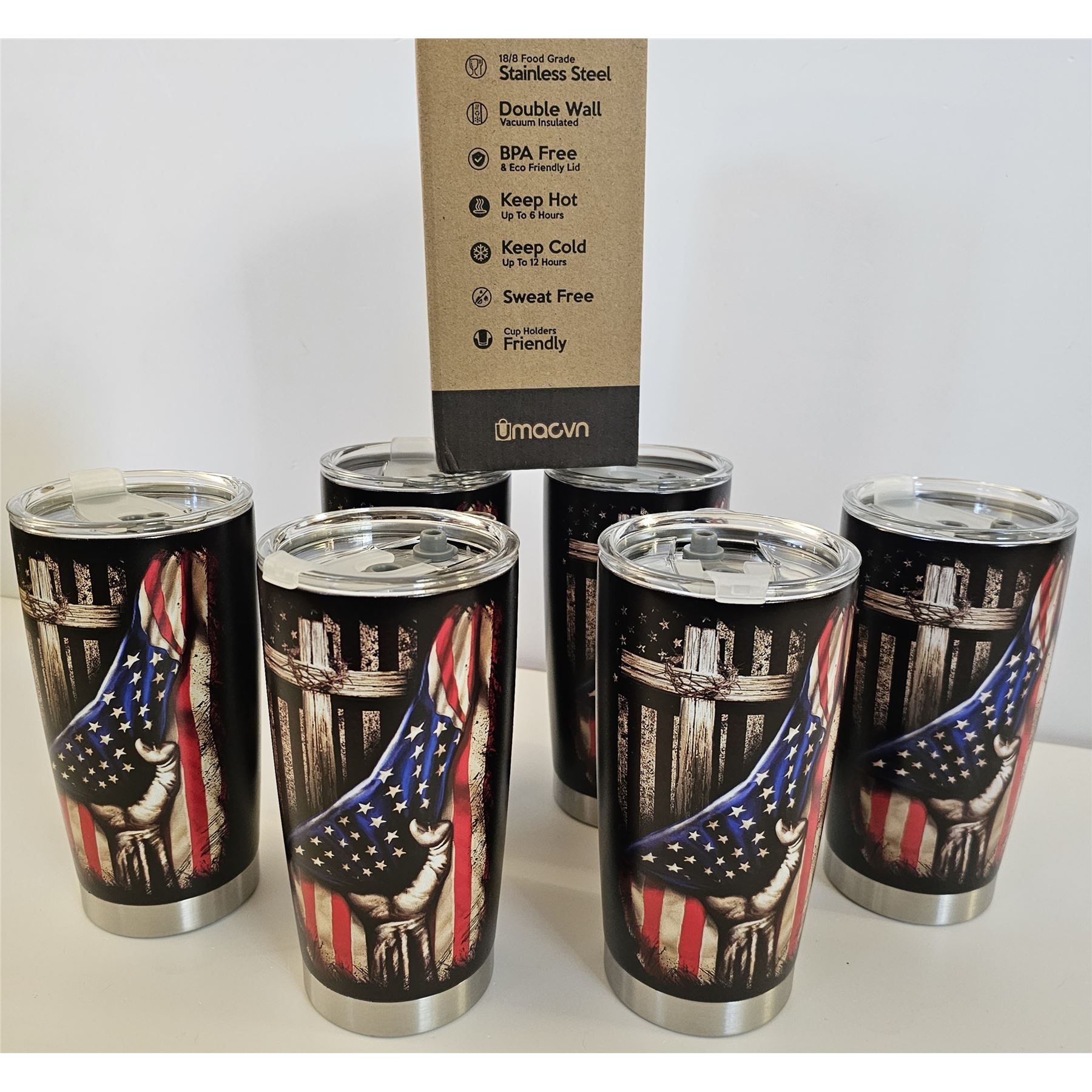 Set of 5 stainless steel tumblers with American flag design, double-wall vacuum insulation, BPA-free lids, new.