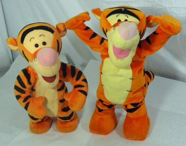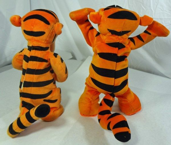 2005 Fisher Price Tumbling Tigger, Does Cartwheels and Talks, H1567, Measures almost 12" in height, Requires 6 AA batteries (not included), One battery compartment is missing the cover. 1998 Mattel Winnie the Pooh Bouncing Talking Tigger PA-60, 12" in height, Requires 3 AA batteries (not included).