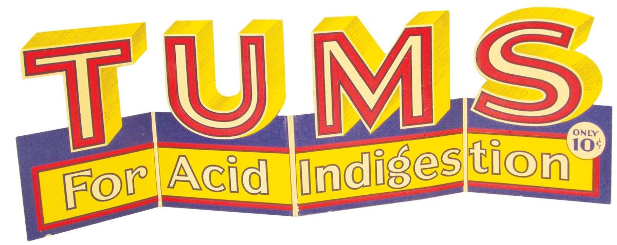 Tums Die Cut Cardboard Four Fold Display. Bold Color. Couple of minor creases otherwise excellent condition. 19 X 6 inches.