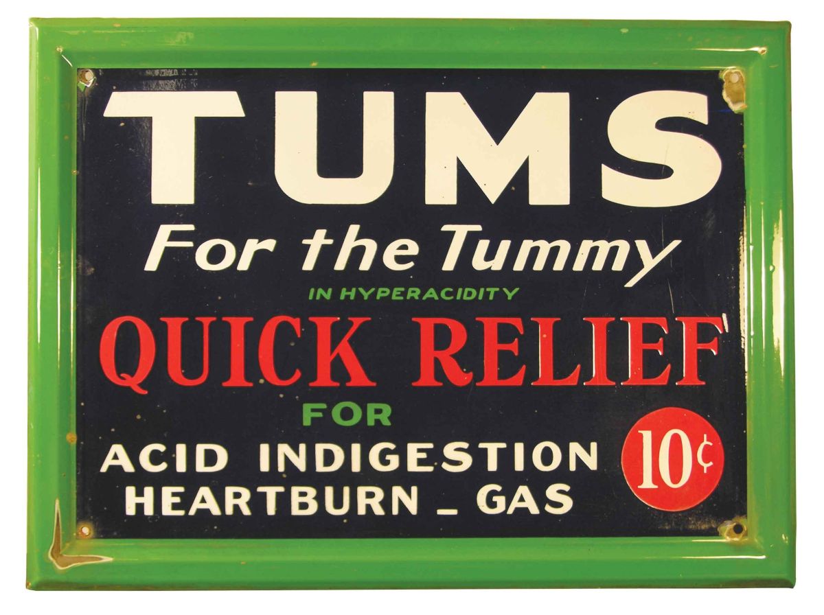 Tums, Self Framed, Porcelain Sign. Chips in corners otherwise good condition. 23 1/2 X 17 1/2 inches.