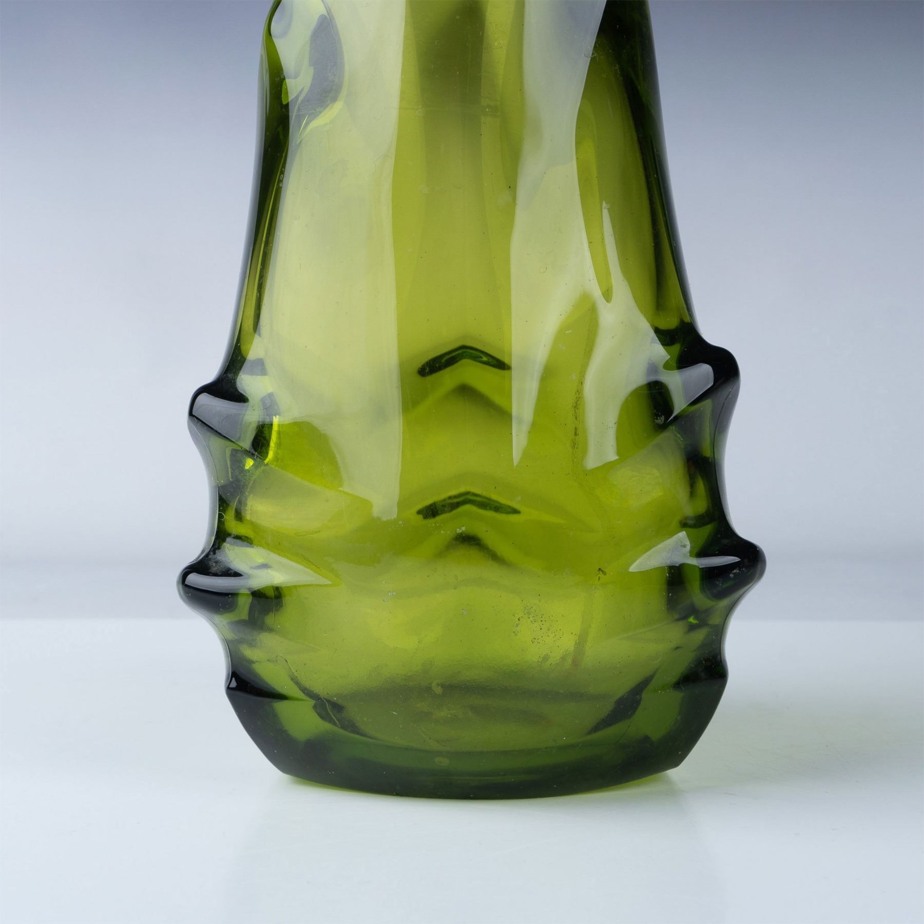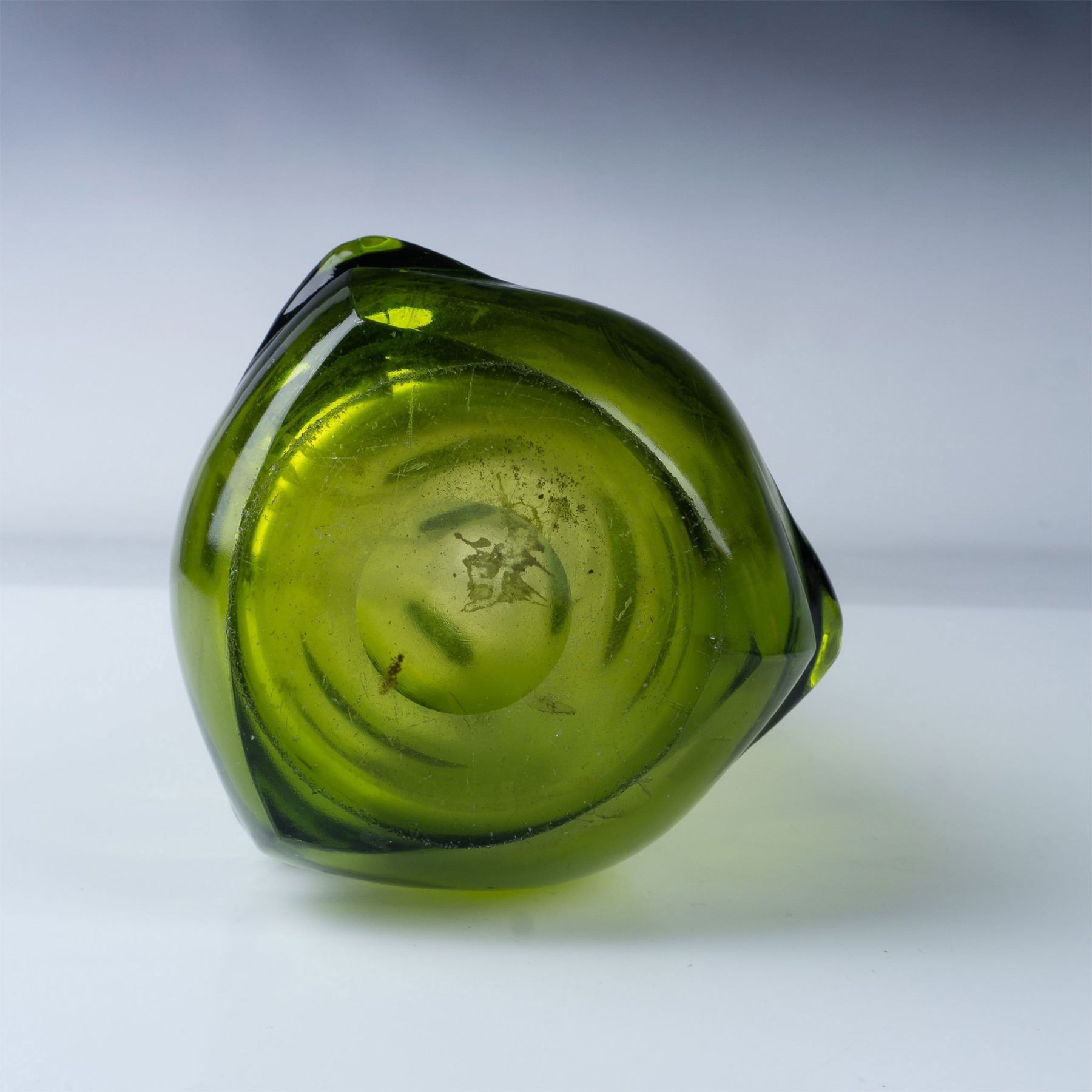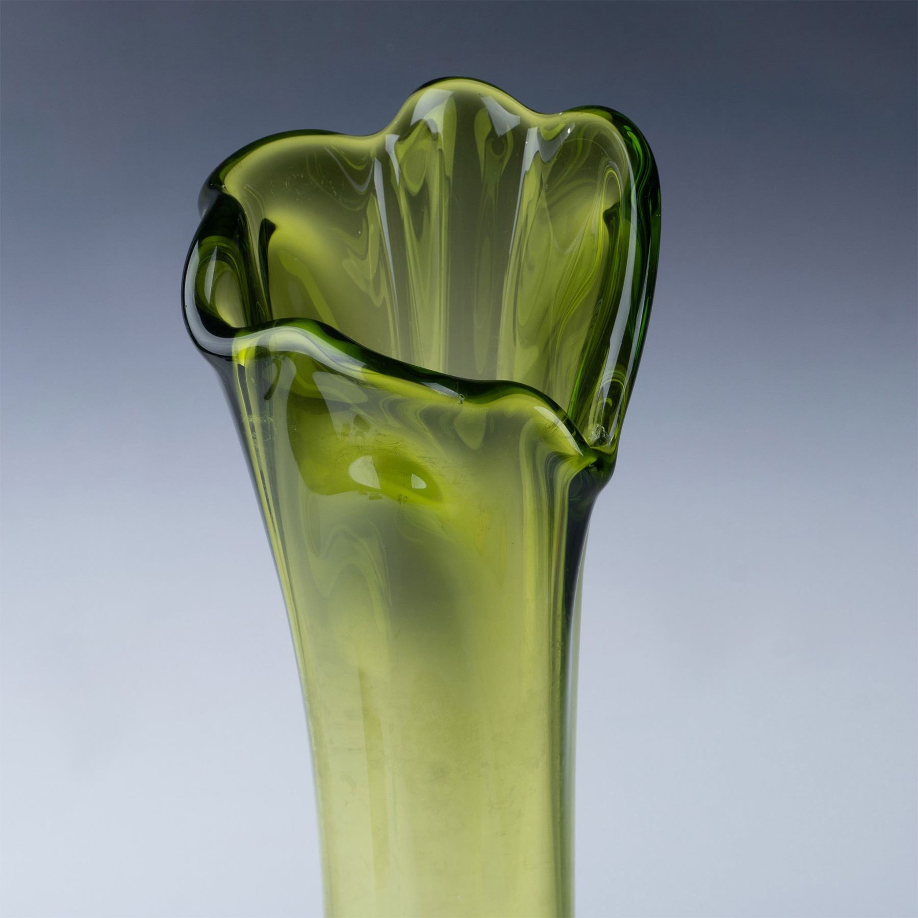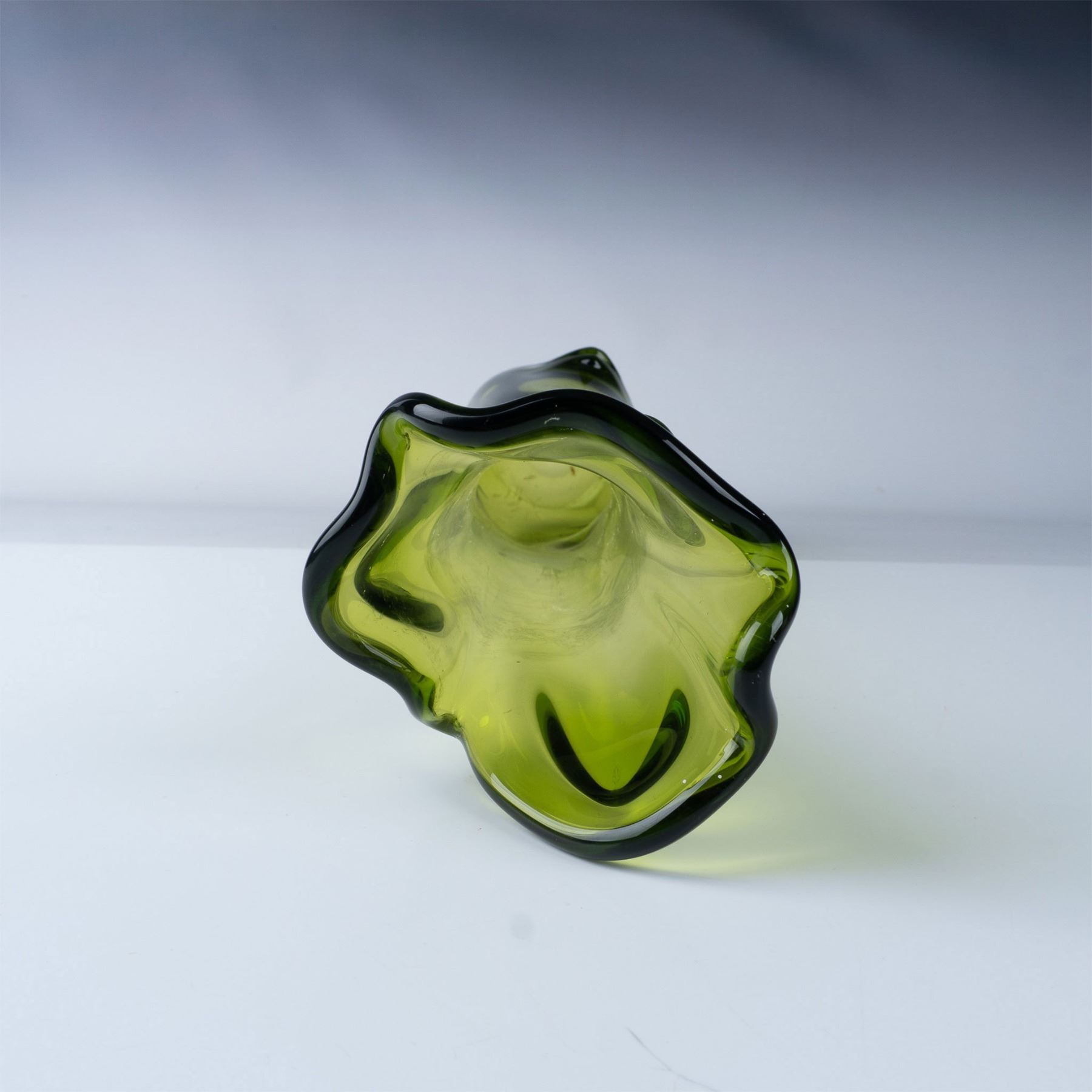 Vase in vibrant green art glass, showcasing a sculptural form with textured, organic details along the base and sides. The flared, irregular rim adds a striking modern touch, highlighting the exceptional craftsmanship. A beautiful mid-century design that serves as an eye-catching decorative piece.