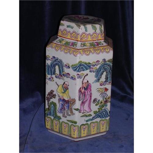 Tung Che porcelain urn with lid. The urn is hexagonal shaped with polychrome enamel.