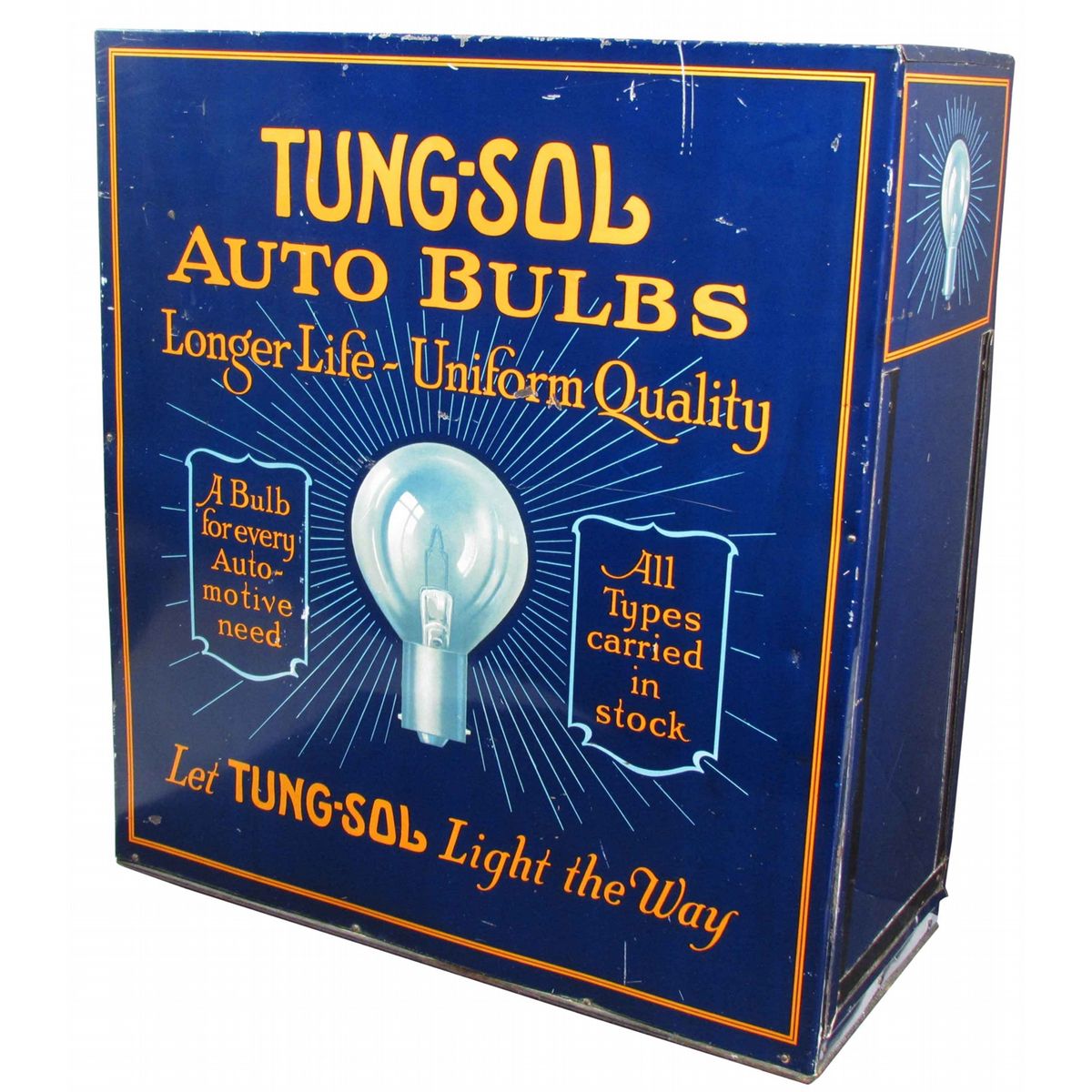 Tung-Sol Auto Bulbs Tin Store Display Cabinet. Scratches otherwise very good condition. 19 X 20 1/2 X 8 1/2 inches.