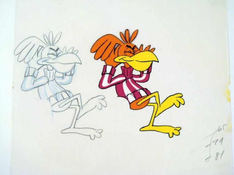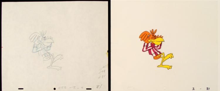LALALALALA... Don't want to hear it.. LALALALALA!! * Original Animation Cel and DrawingOriginal "rough" animation drawing, in black and non-photo blue pencil with the notations in black and non-photo blueOverall size is 12-field drawing that is 10 1/2" x 12 1/2"Overall size of cel: 10 1/2" x 12 1/2"Very Good Condition * This is an original hand-painted cel was used in the production of a "Coco Puffs" TV Commercial. Each cel represents a slight change in position of the characters. When individually photographed and projected in rapid succession, the images appear to move. * To create production cels, the original animator's drawing is transferred onto an acetate cel (by hand-inking and/or photo copying). The cel is then hand-painted on the reverse side. * * * The background, drawing, and cel are ready to be matted and framed. The animator's notations are shown at the bottom of both.