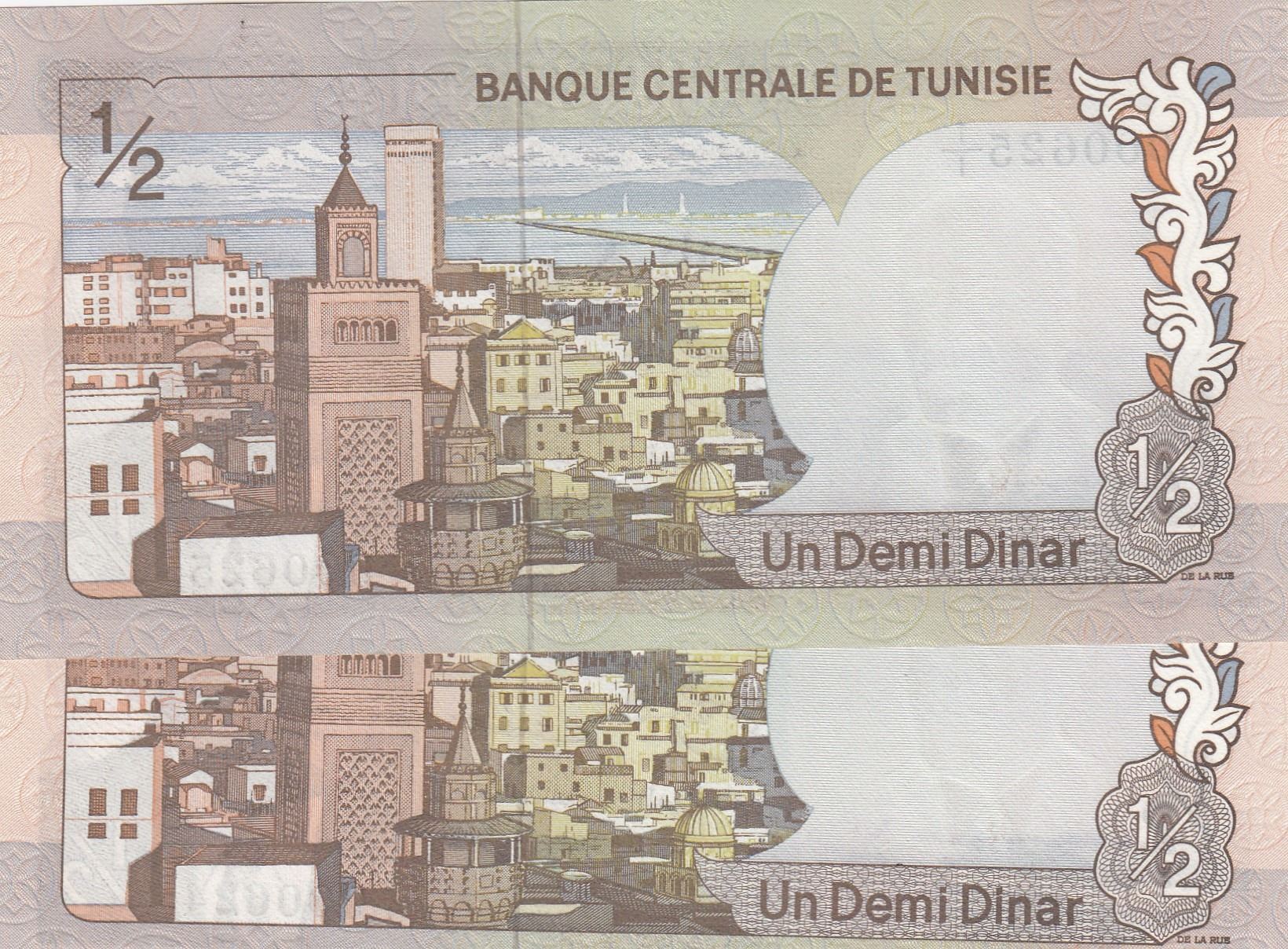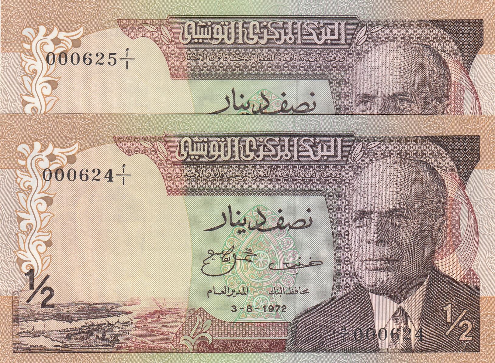 Tunisia, 1/2 Dinar, 1972, UNC, p66, "Low Serial numbers"i (Total 2 consecutive banknotes)br/serial numbers: A/1 000624-5