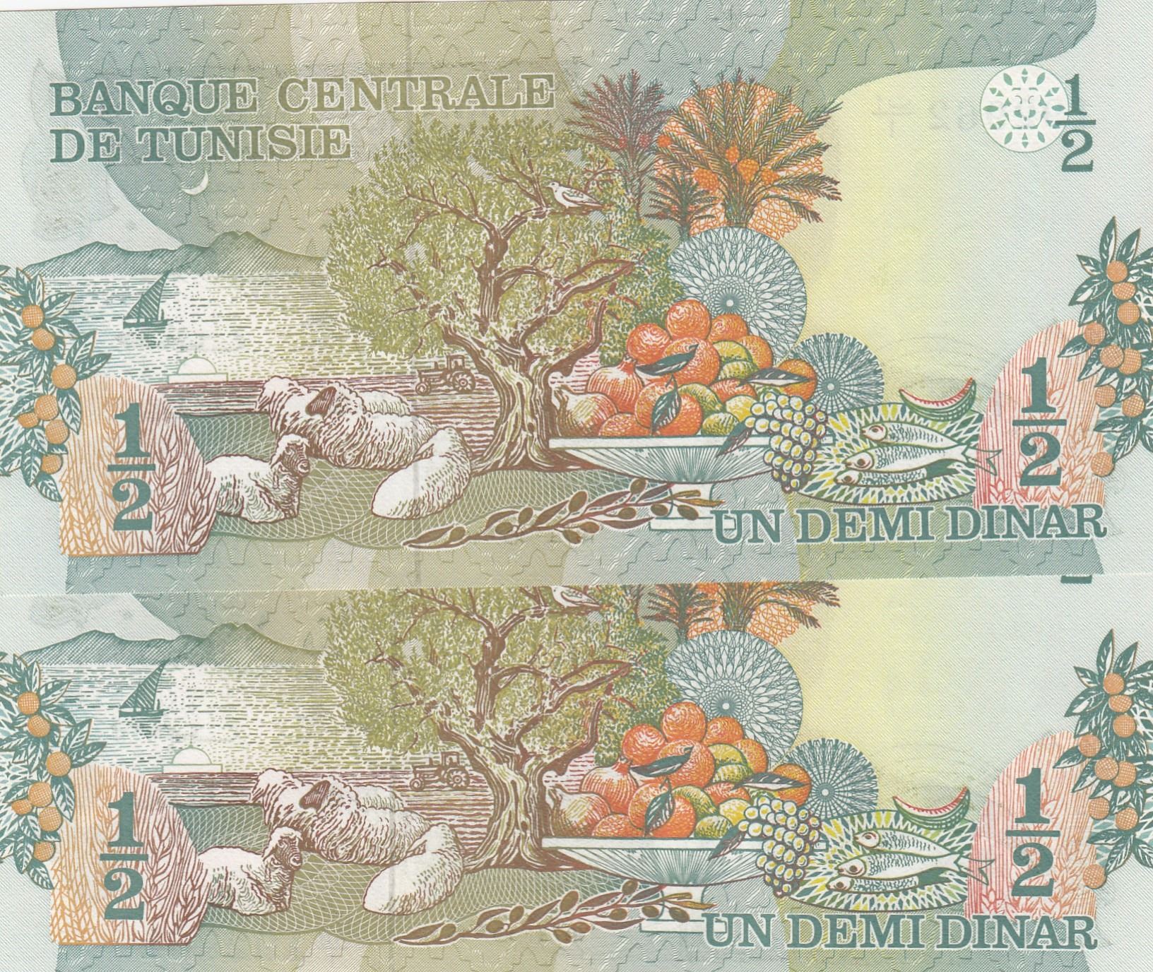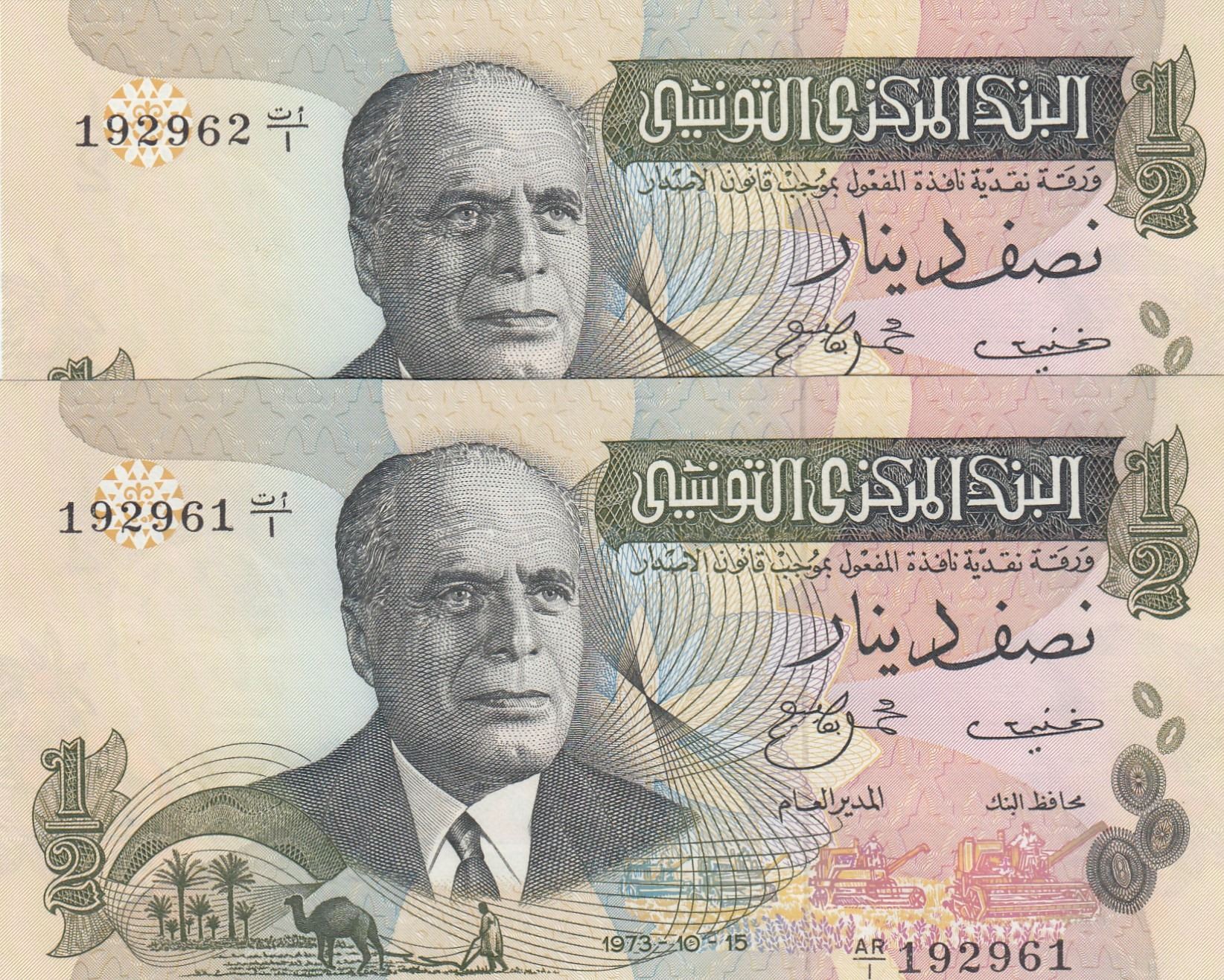 Tunisia, 1/2 Dinar, 1973, UNC, p69r, REPLACEMENT, (Total 2 consecutive banknotes)br/serial numbers:
