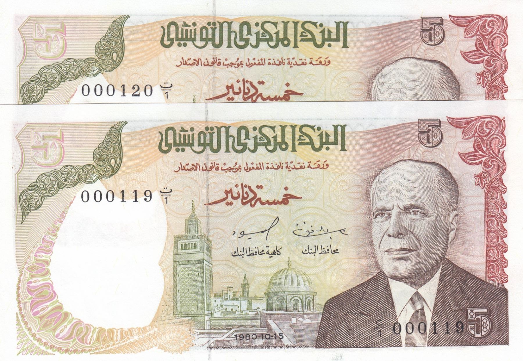 Tunisia, 10 Dinars, 1980, UNC, p76, "Low Serial numbers", (Total 2 consecutive banknotes)br/serial numbers: C/1 000119-20