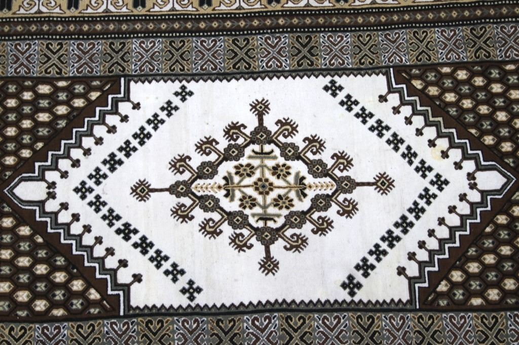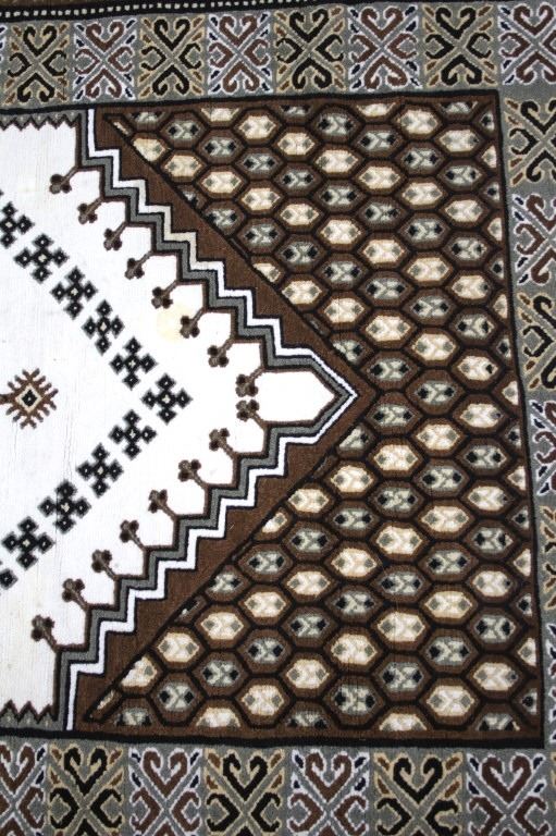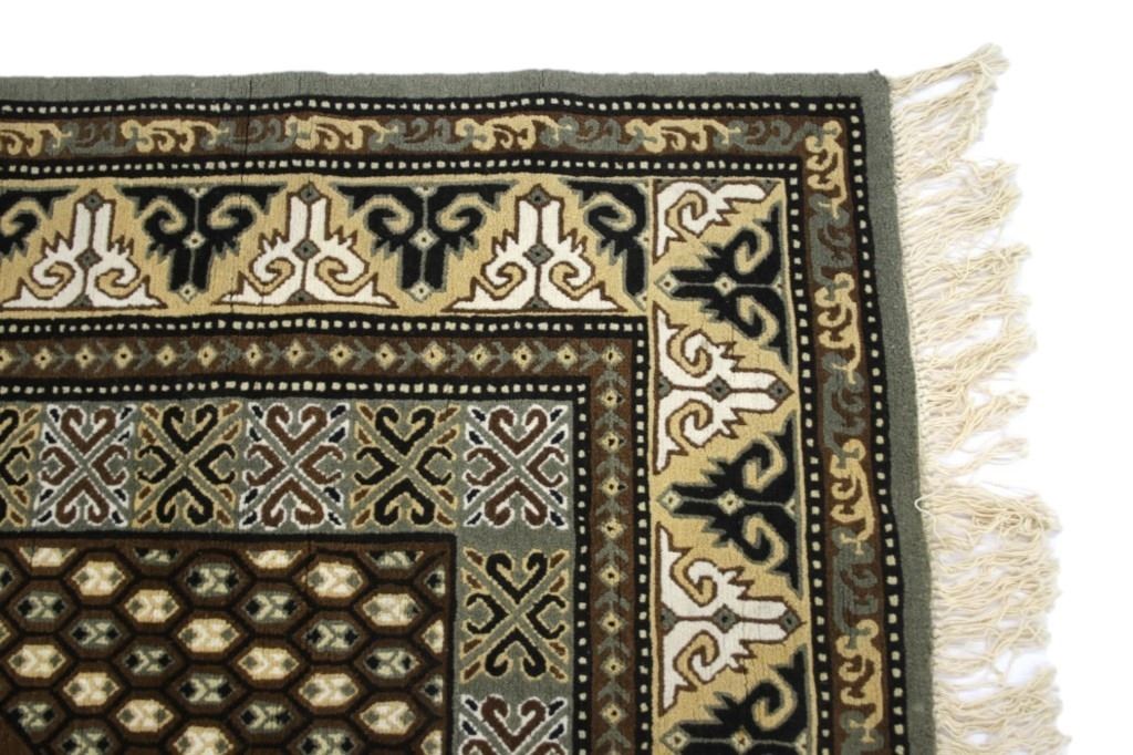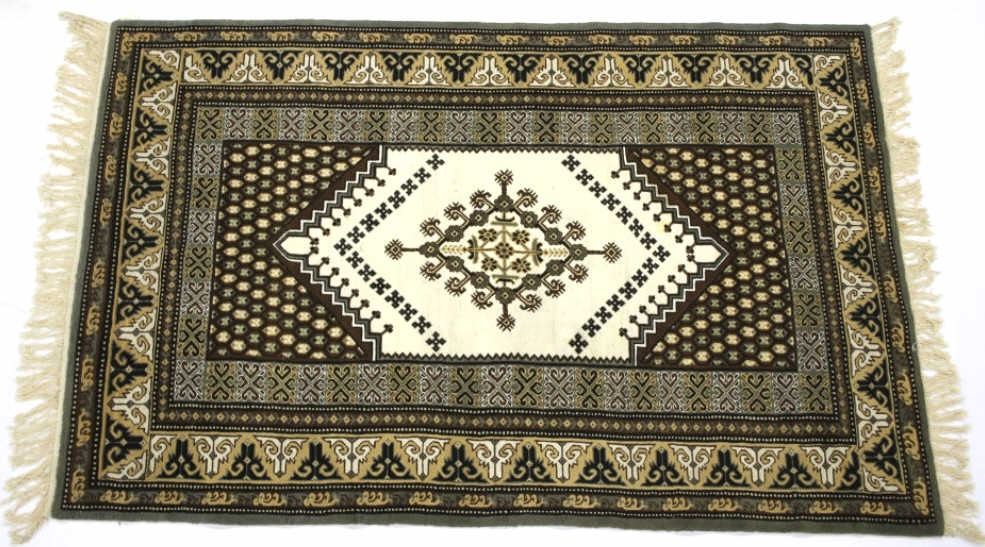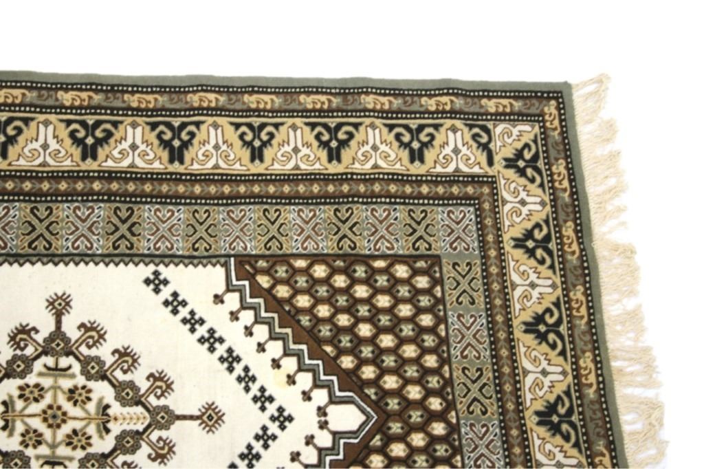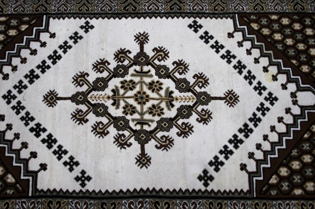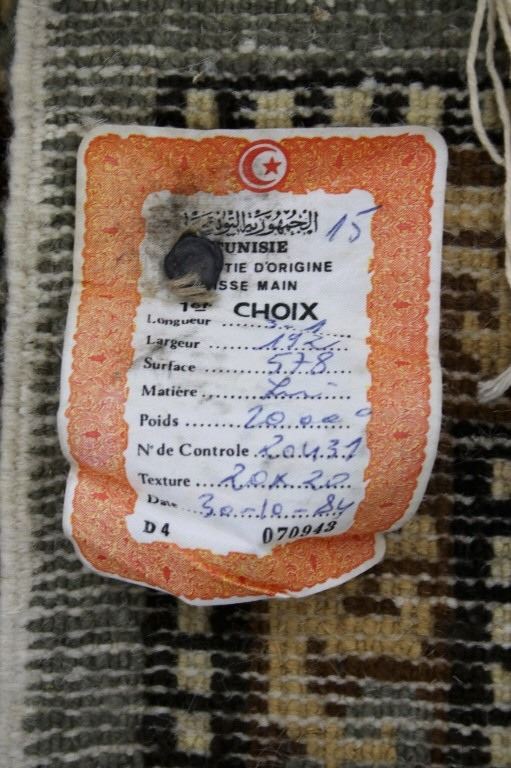Featured in this lot we have a Tunisian hand woven wool Zarbia area rug originating from 1984. The Zarbia rugs are one of the most common Tunisian rugs and originate from Kairouan, Tunisia. The rug displays a multi layered border with a large central medallion design. The rug shows geometric and floral patterns across the piece with the center medallion design. The piece shows geometric designs mirrored in each corner. The rug displays colors of brown, tan, green, black, grey, and white. The rug shows white tassels across each end of the piece. The underside of the rug shows an info tag with the top reading "TUNISIE GARANTIE DORIGINE TISSE MAIN" with information on the construction and manufacture date in 1984. The rug shows good condition overall with little to no wear. The rug weighs 34lbs 2oz. The rug measures 75" wide by 117" long.