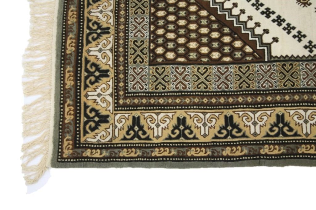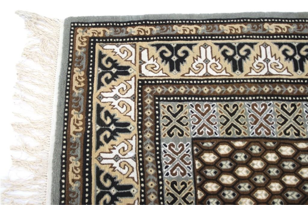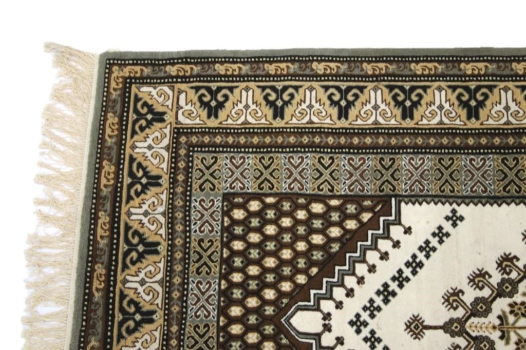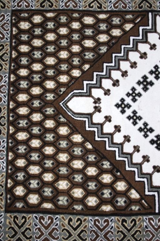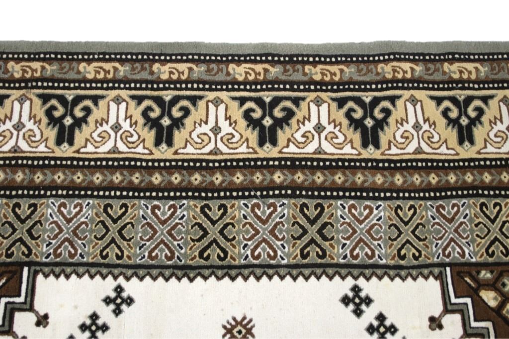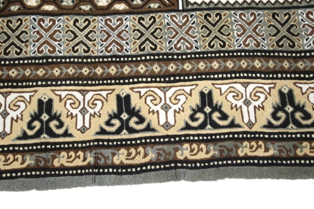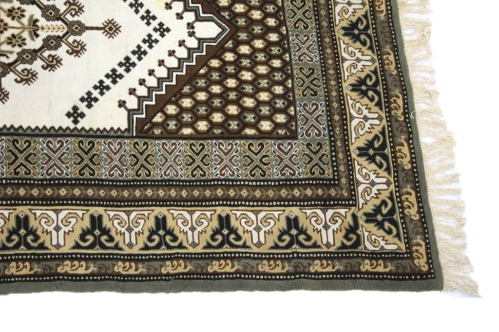 Featured in this lot we have a Tunisian hand woven wool Zarbia area rug originating from 1984. The Zarbia rugs are one of the most common Tunisian rugs and originate from Kairouan, Tunisia. The rug displays a multi layered border with a large central medallion design. The rug shows geometric and floral patterns across the piece with the center medallion design. The piece shows geometric designs mirrored in each corner. The rug displays colors of brown, tan, green, black, grey, and white. The rug shows white tassels across each end of the piece. The underside of the rug shows an info tag with the top reading "TUNISIE GARANTIE DORIGINE TISSE MAIN" with information on the construction and manufacture date in 1984. The rug shows good condition overall with little to no wear. The rug weighs 34lbs 2oz. The rug measures 75" wide by 117" long.