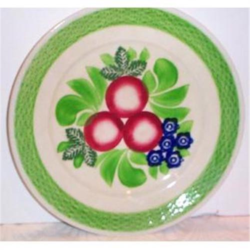 This is an extremely colorful and quite well executed Stick Spatter or Brushstroke Early English Plate that is decorated with bright fruit and a green basketweave design around the outside periphery of the plate. This plate is in SUPERIOR condition with no chips, cracks, dings or hairlines but does have the normal crazing that you would expect from a plate of this age. The plate measures 9.25" in diameter and is marked on the back with the English Tunstall Makers Logo. A real find--- don't let it pass you by !!!