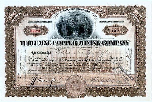 1918, Arizona. Stock certificate for 100 shares. Brown/Black. Nice engraved vignette of miners at work at top center. Lightly punch cancelled and Extremely Fine.