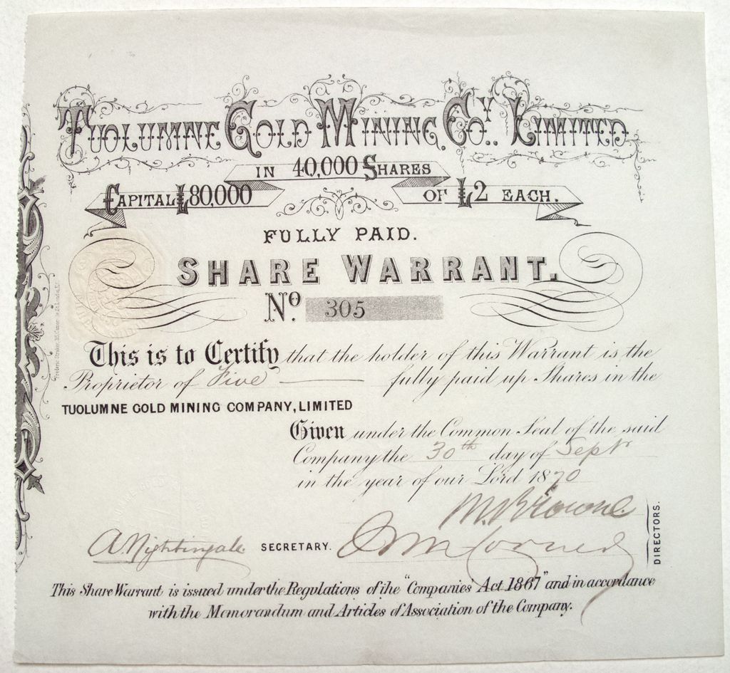 Tuolumne Gold Mining Co. Limited 2 share warrant stock certificate